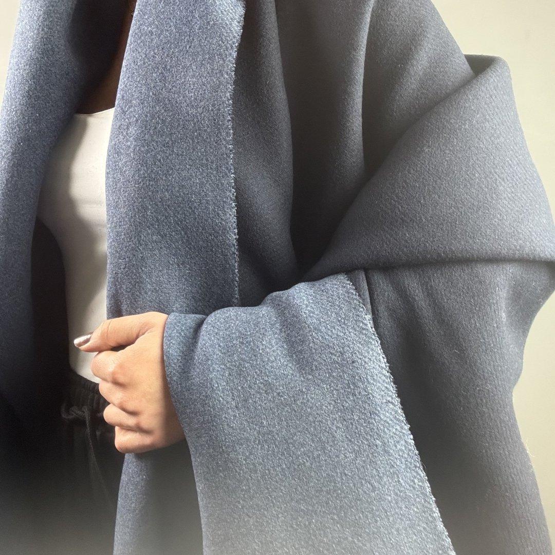Italian Reversible Blues is 150cm wide. This is such a clever and versatile cloth Italian cloth that is ideal for coats, jackets, cardigans, wraps, capes and so much more.