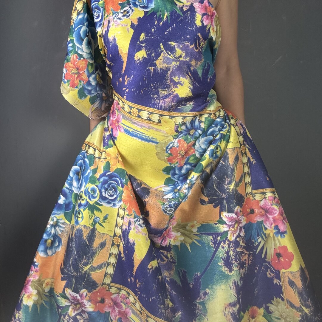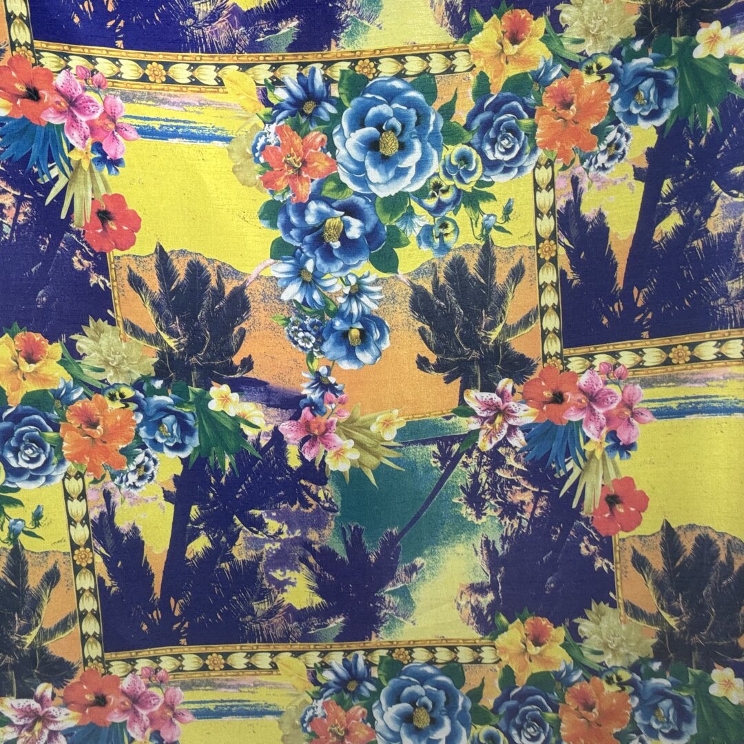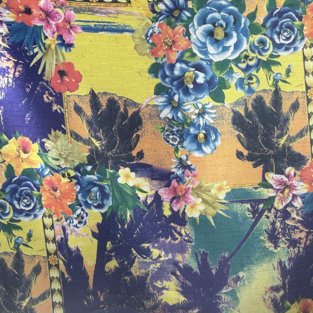 Italian Polyester, Cotton and Rayon is 140cm wide. This vibrant fabric is full of colour and life. It is a medium-weight cloth with excellent structure and body, allowing it to hold its shape and deliver a couture finish.