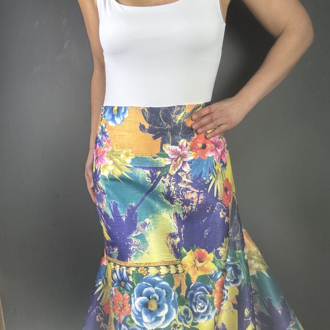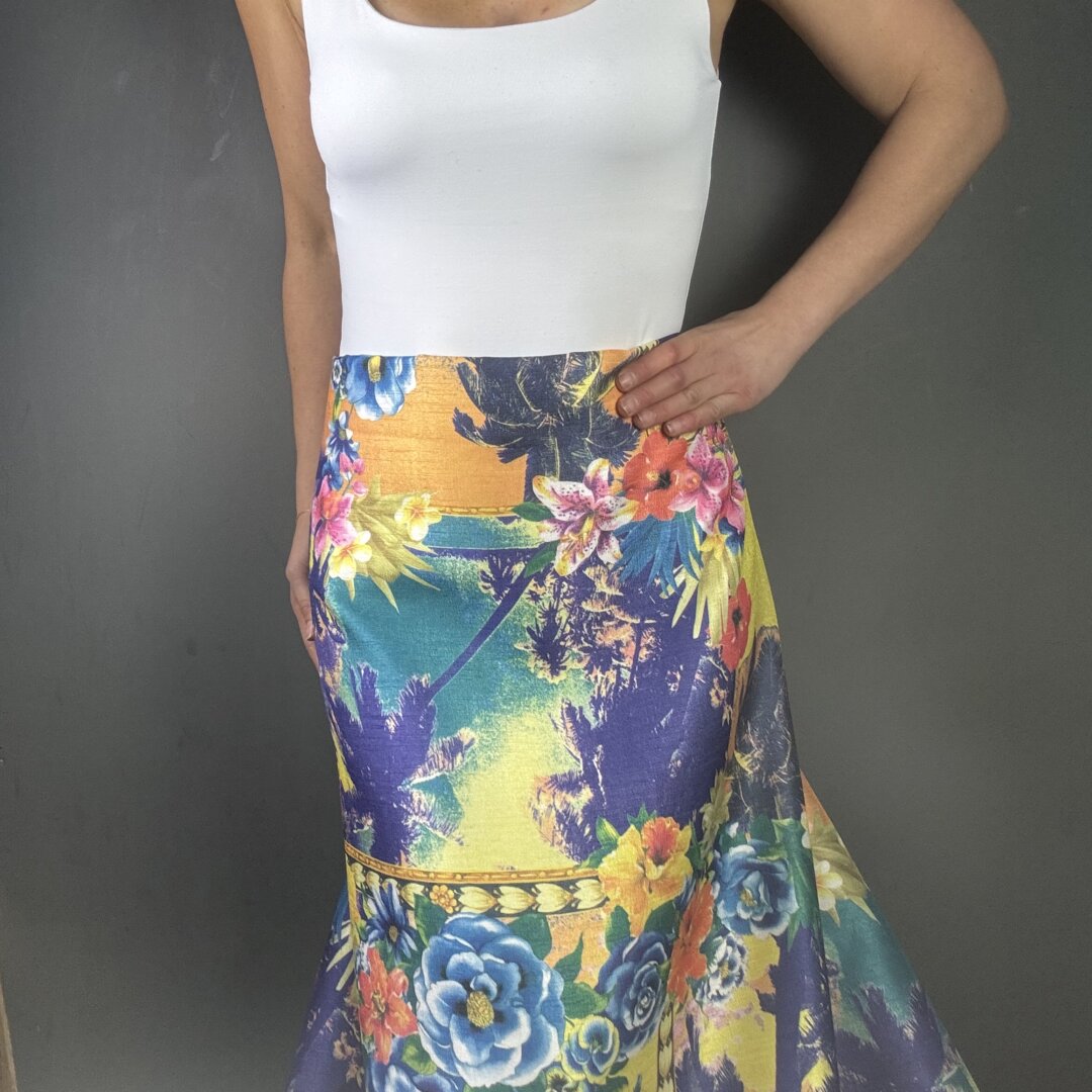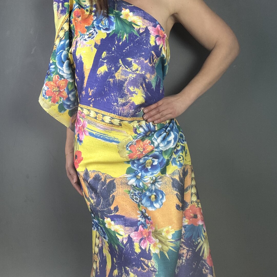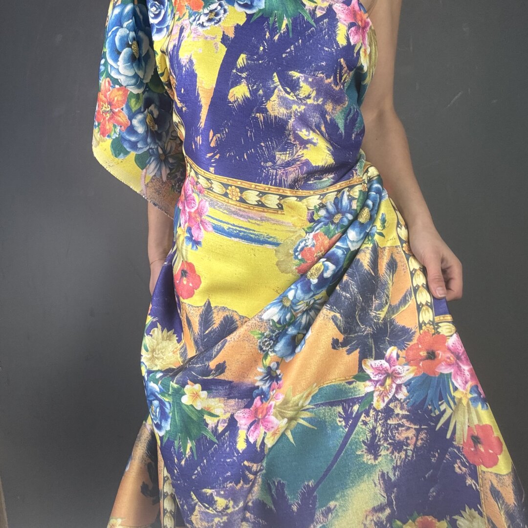 Italian Polyester, Cotton and Rayon is 140cm wide. This vibrant fabric is full of colour and life. It is a medium-weight cloth with excellent structure and body, allowing it to hold its shape and deliver a couture finish.