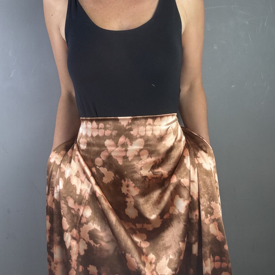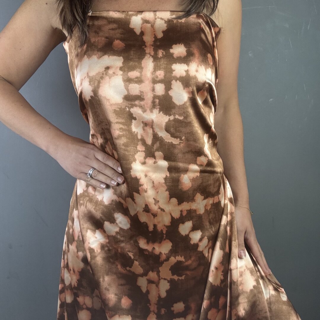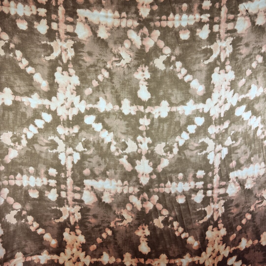 Italian Tye Dye Brown Heavy Polyester is 150cm wide. This is a stunning quality fabric. It has a beautiful heavy drape to it and is perfect for swishy dramatic garments.