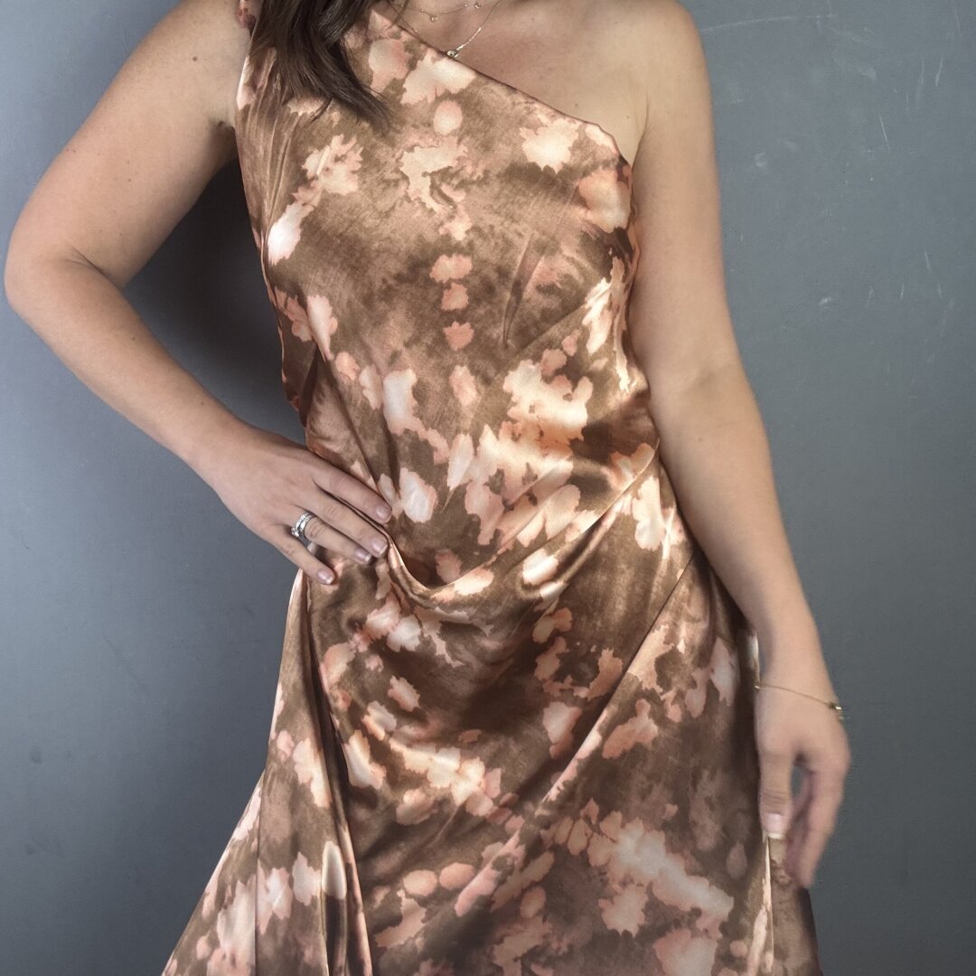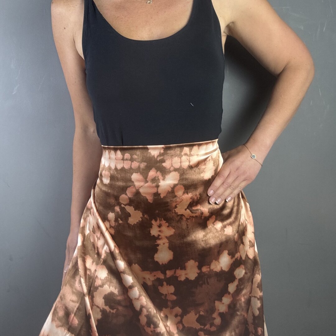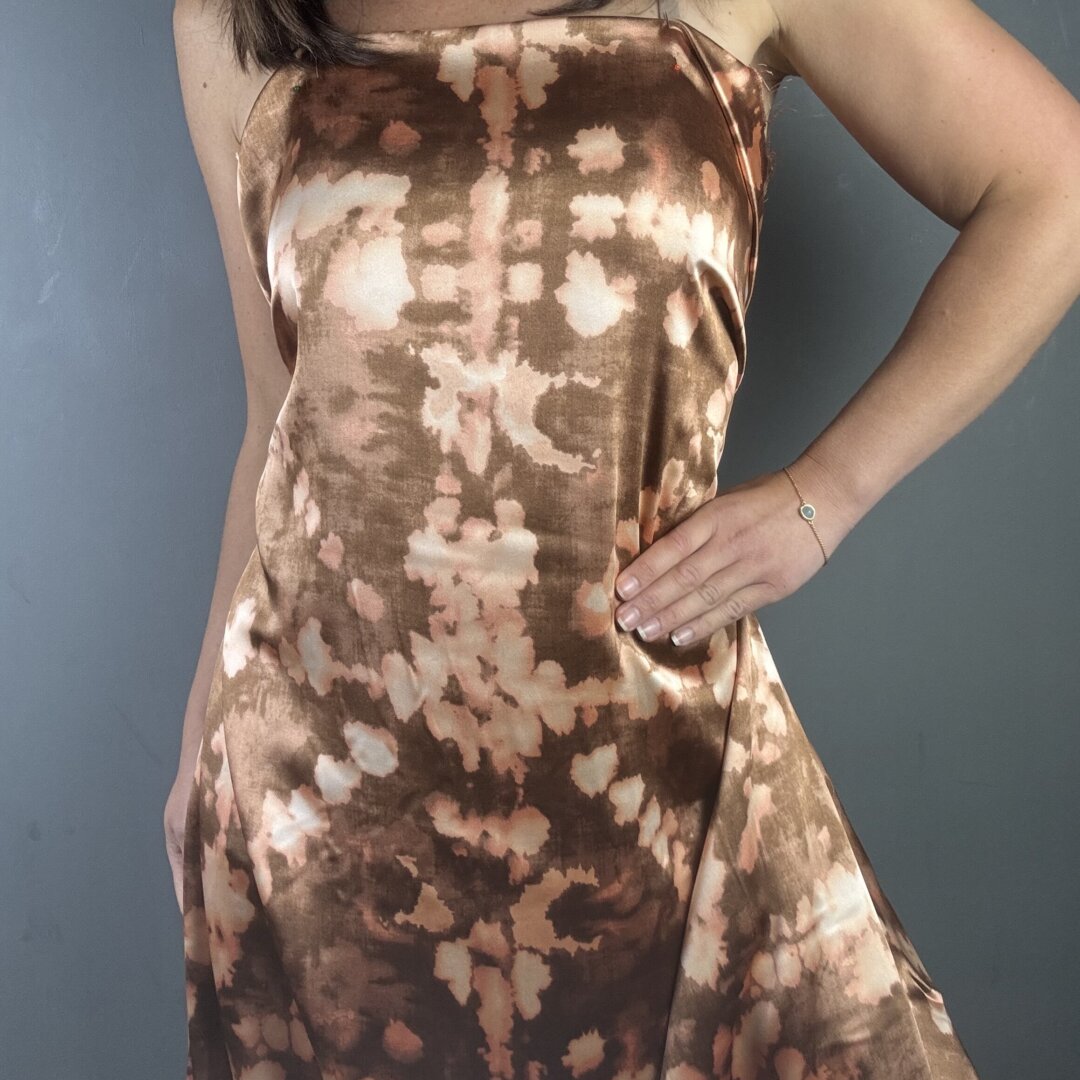Italian Tye Dye Brown Heavy Polyester is 150cm wide. This is a stunning quality fabric. It has a beautiful heavy drape to it and is perfect for swishy dramatic garments.