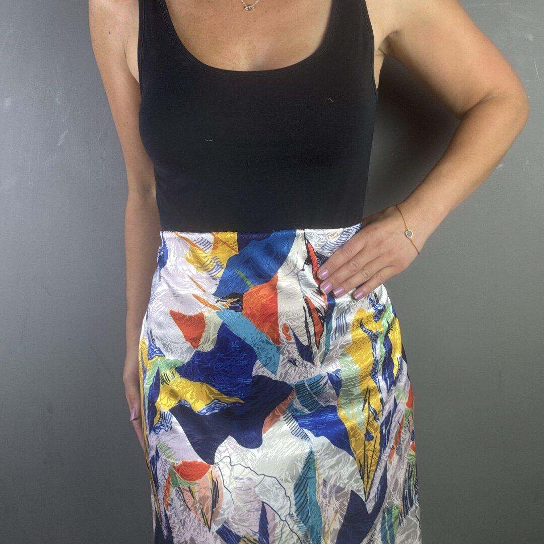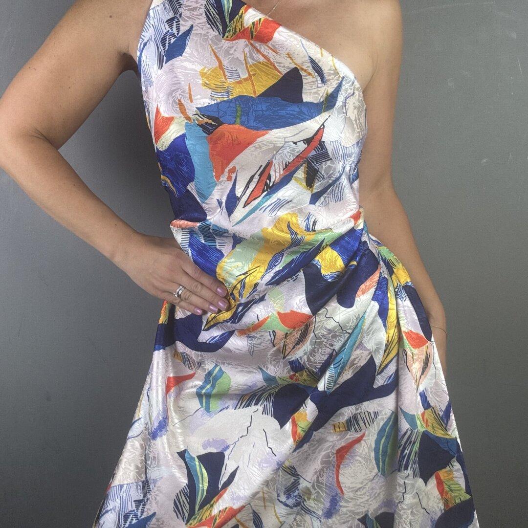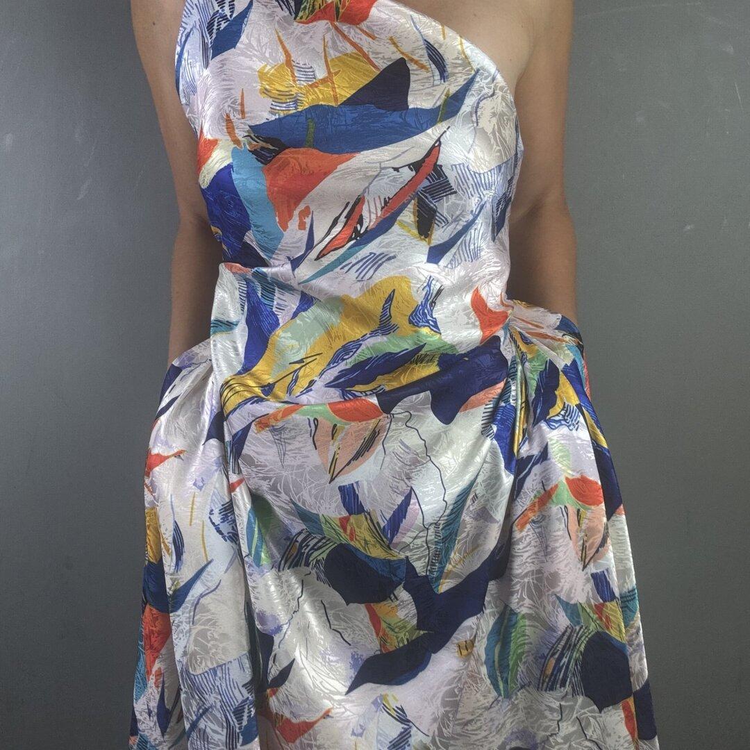 Jacquard Polyester Art Pallet is 145cm wide. This is a light weight fabric with a beautiful fluid drape and a small about of lycra. This stunning vibrant colourful design on a very special jacquard polyester cloth will be a pleasure to wear.