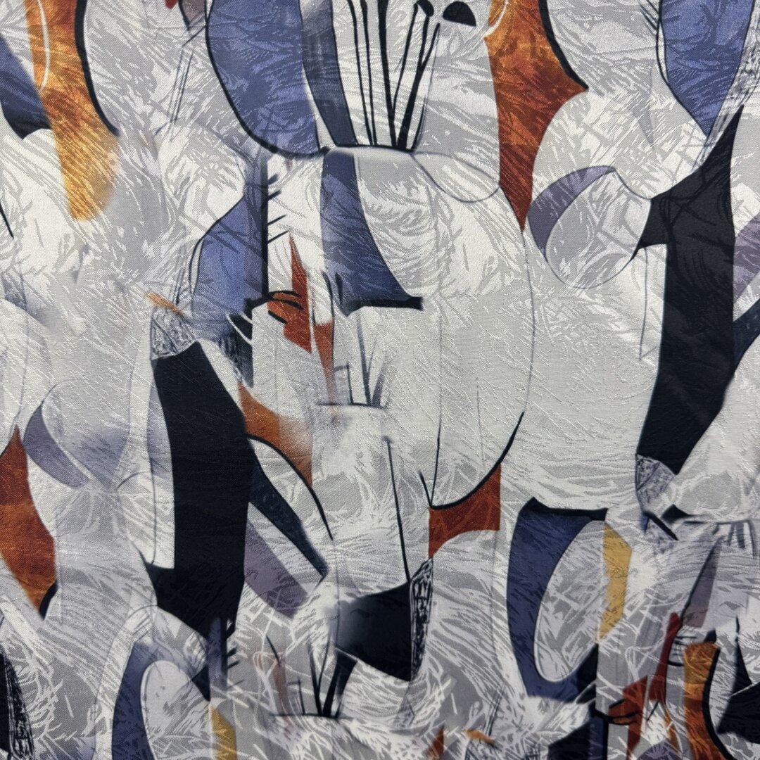 Jacquard Polyester Ice World is 145cm wide. This is a light weight fabric with a beautiful fluid drape and a small about of lycra. A stunning vibrant floral design on a very special jacquard polyester cloth will be a pleasure to wear.