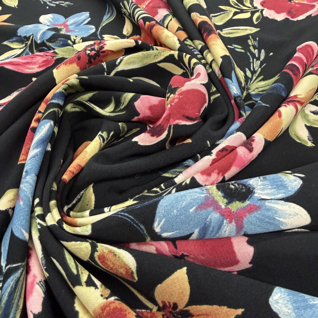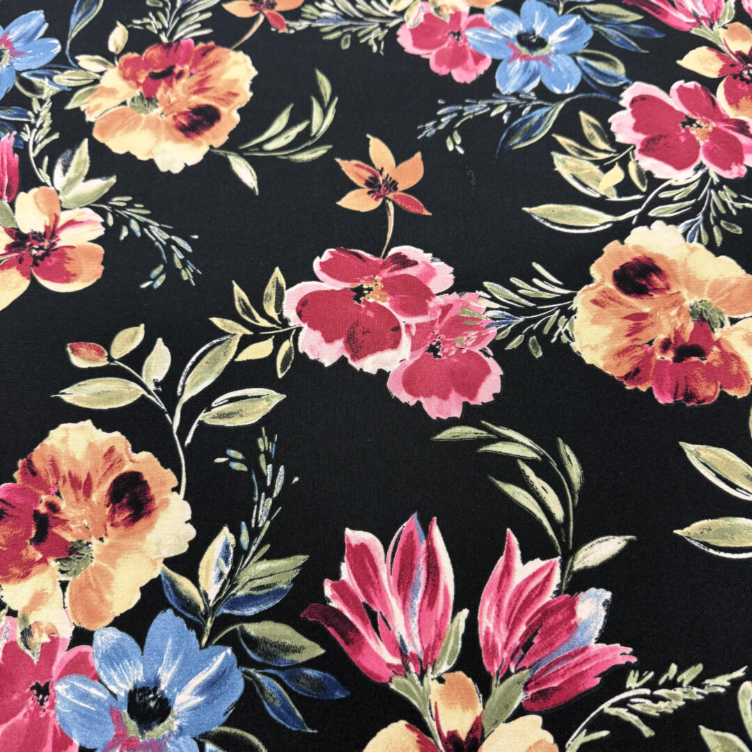 Black Floral German Polyester , 100% polyester, 145cm wide.