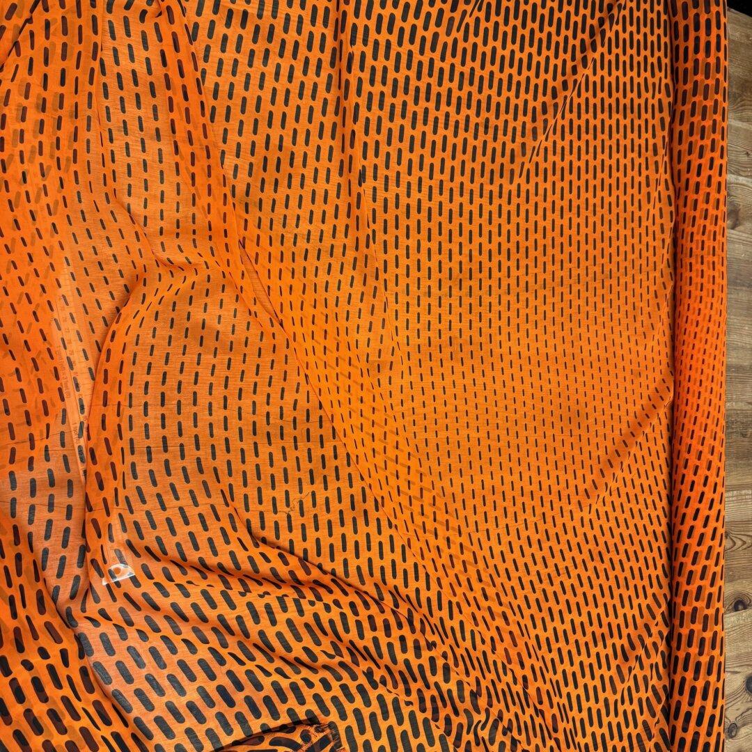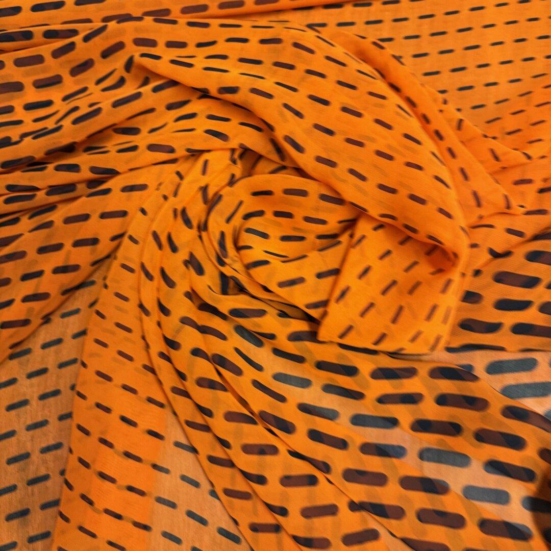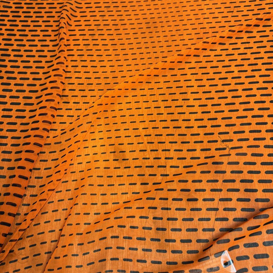 Last Chance To Buy Italian Polyester , 140cm wide. Featuring this beautiful stand out dash print with a bright orange base with black dashes in an Italian polyester perfect to create, dresses, blouses, tops, shirts, skirts and so much more. This fabric is perfect to sew with and a great fabric for any season! Please note there is a slight print fault see images for more details.