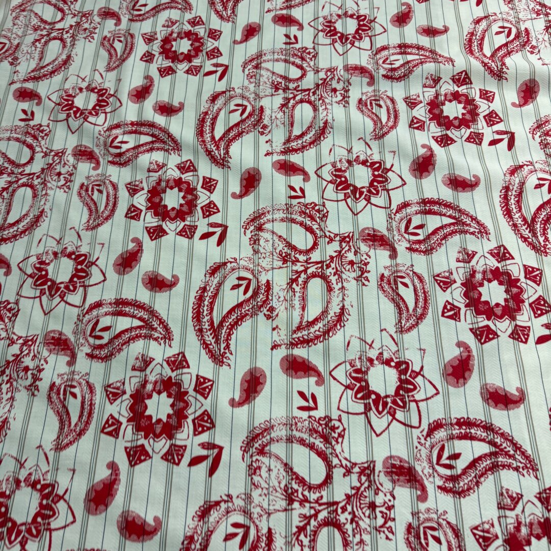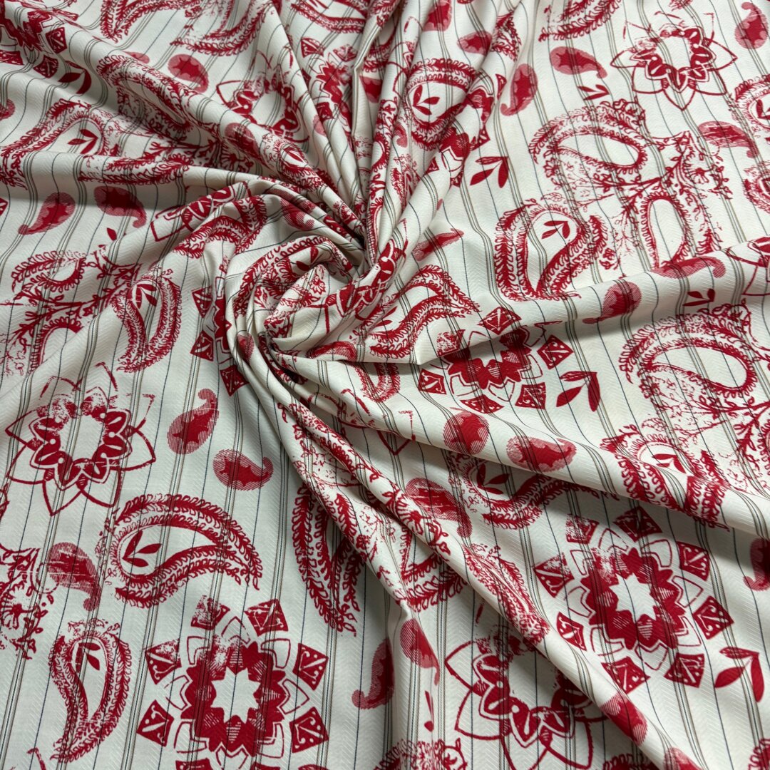 Italian Pure Cotton, 150cm wide. Featuring this beautiful paisley print design with a stripe base , perfect for the upcoming season! Ideal to create dresses, tops, co- ords ,skirts, shirts, blouses and more.