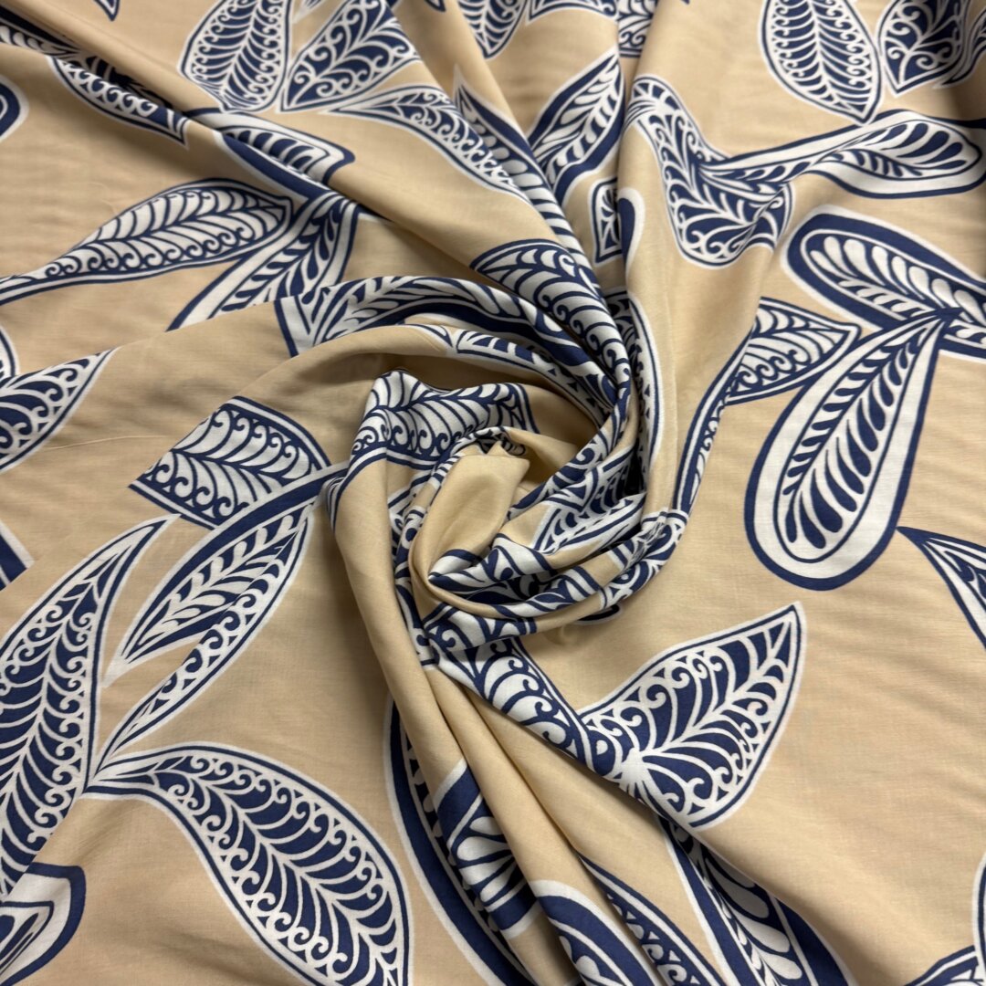 Italian Rayon, 140cm wide. Featuring this sand base colour with a navy paisley print design , perfect for the upcoming Spring Summer season! Ideal to create dresses, tops, co- ords ,skirts, blouses and more.