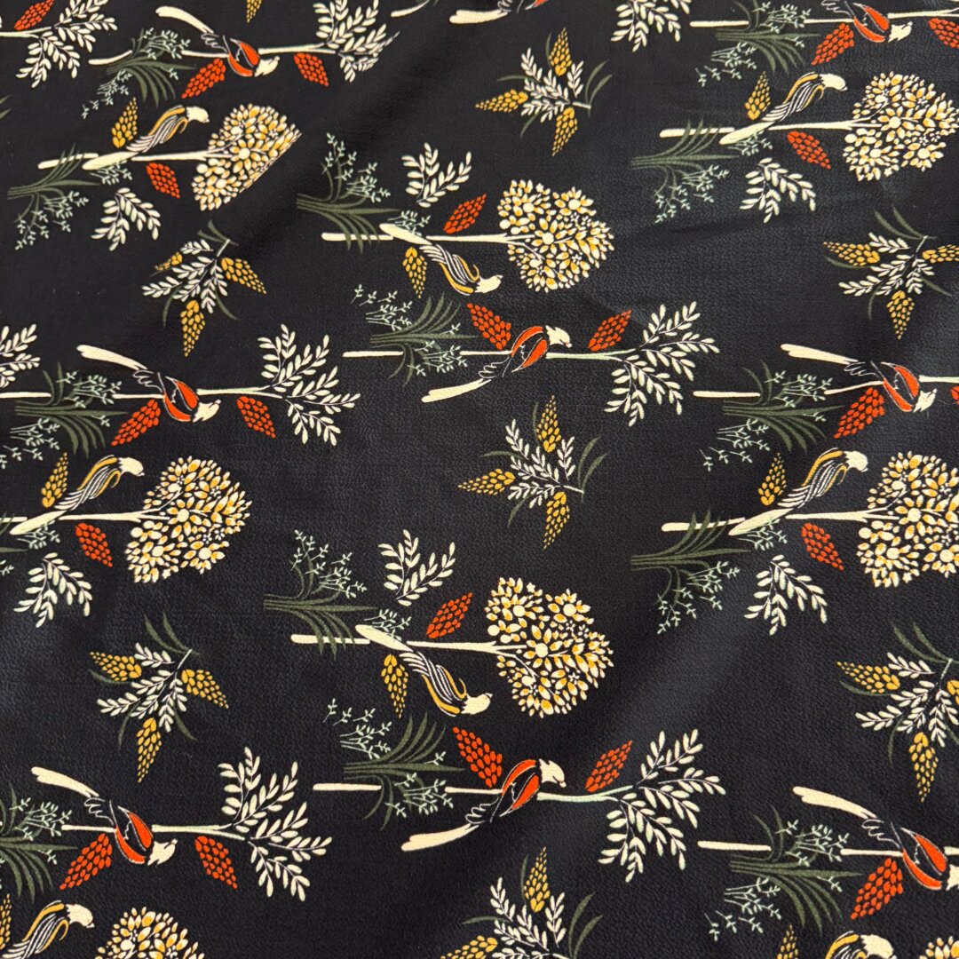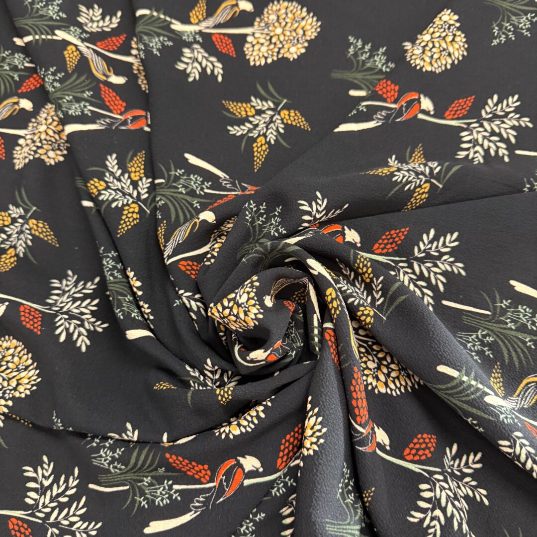 Polyester , 145cm wide. Featuring this beautiful floral print design , perfect for the upcoming season! Ideal to create floaty dresses, tops, co- ords ,skirts, blouses and more.