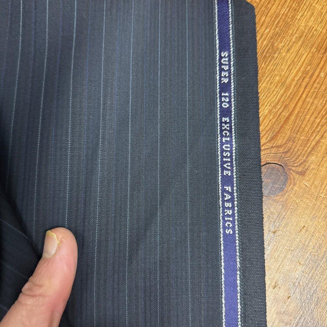 Last Chance To Buy Super 120’s Wool , 150cm wide. Featuring this beautiful navy pinstripe design in super 120’s wool base perfect to create, cardigans, jumpers, capes , and so much more. This fabric is a stand out and perfect for sewing!