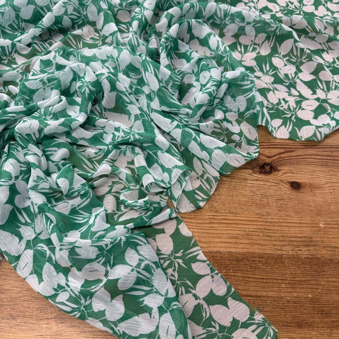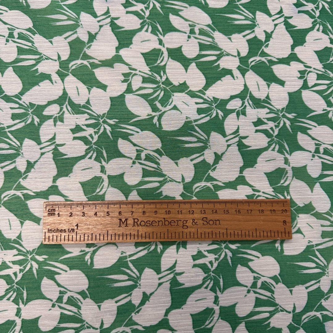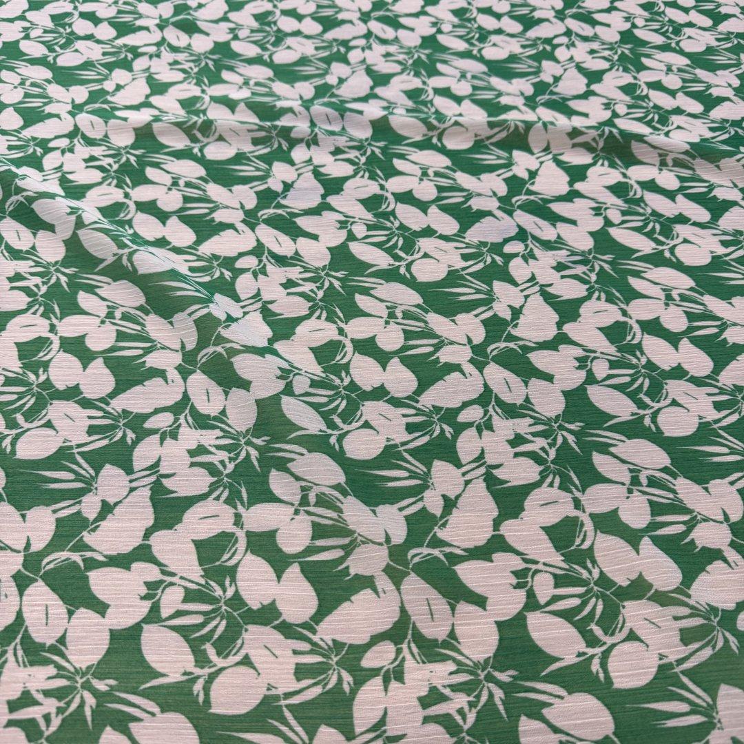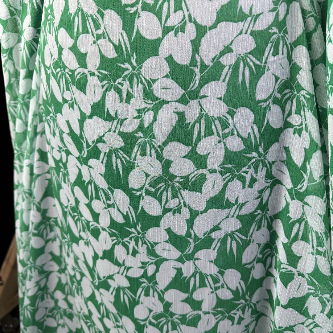 Minty Flowers is 150cm wide. This is a light weight, transparent crinkle polyester. With lots of flowers coving the entire fabric this cloth is ideal for maxi dresses, shirts, tops, beach wraps, kaftans and more.
