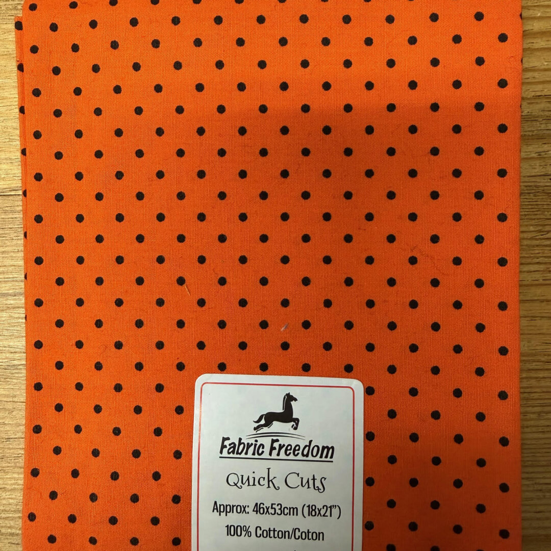 Orange ground with black spot fat quarter. Ideal for quilting, patchwork, and appliqué.