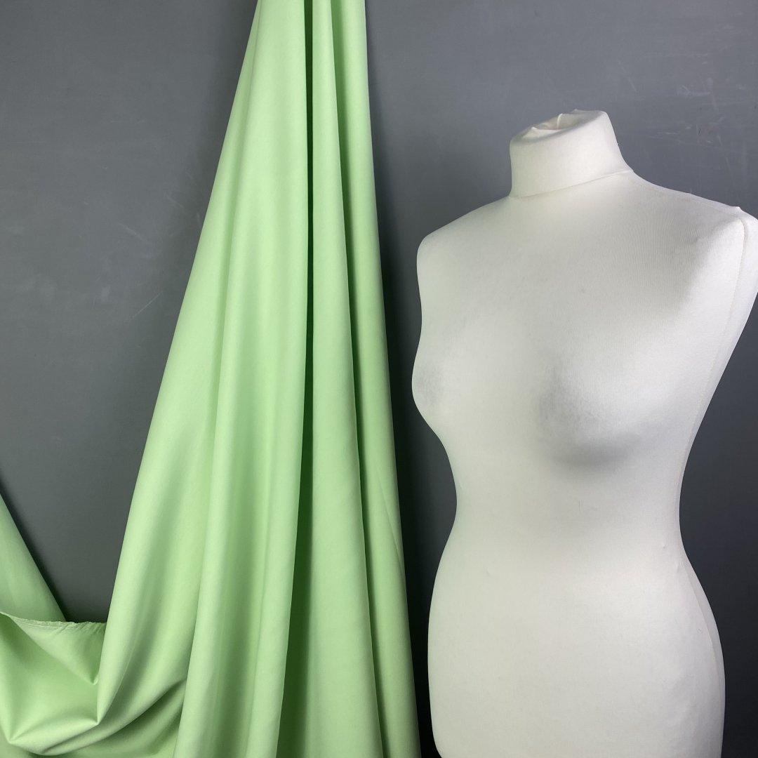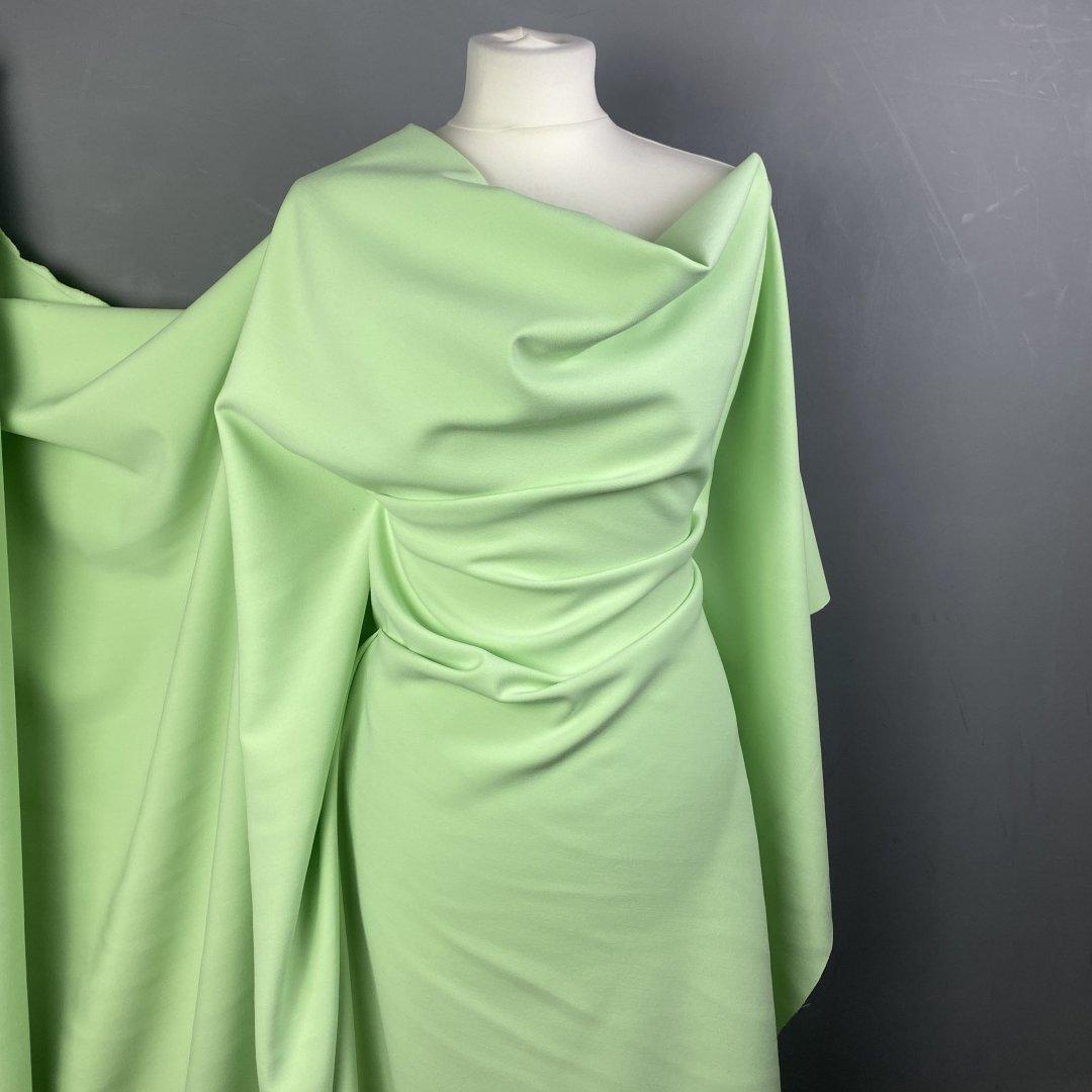 Pale Green Polyester is 150cm wide. This is a swishy polyester with a heavy fluid drape from a well known international fashion house where they created bold tailored suits. This fabric will also create a glamours garment suitable for jumpsuits, wide leg trousers, tops, off the shoulder dresses, maxi dresses and more. The true colour is shown on the mannequin. Hurry … nothing haunts you like the fabric you didn’t buy. While stocks last!!