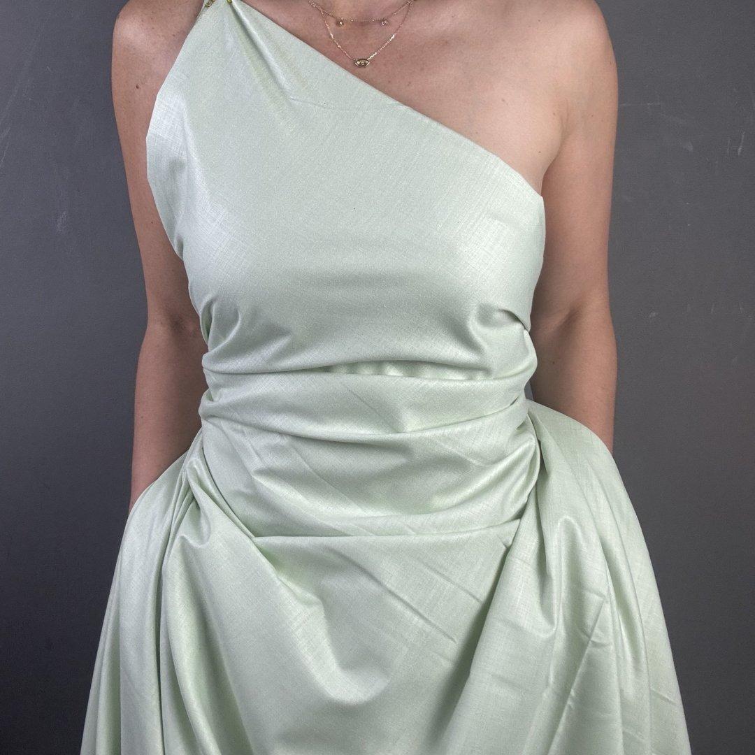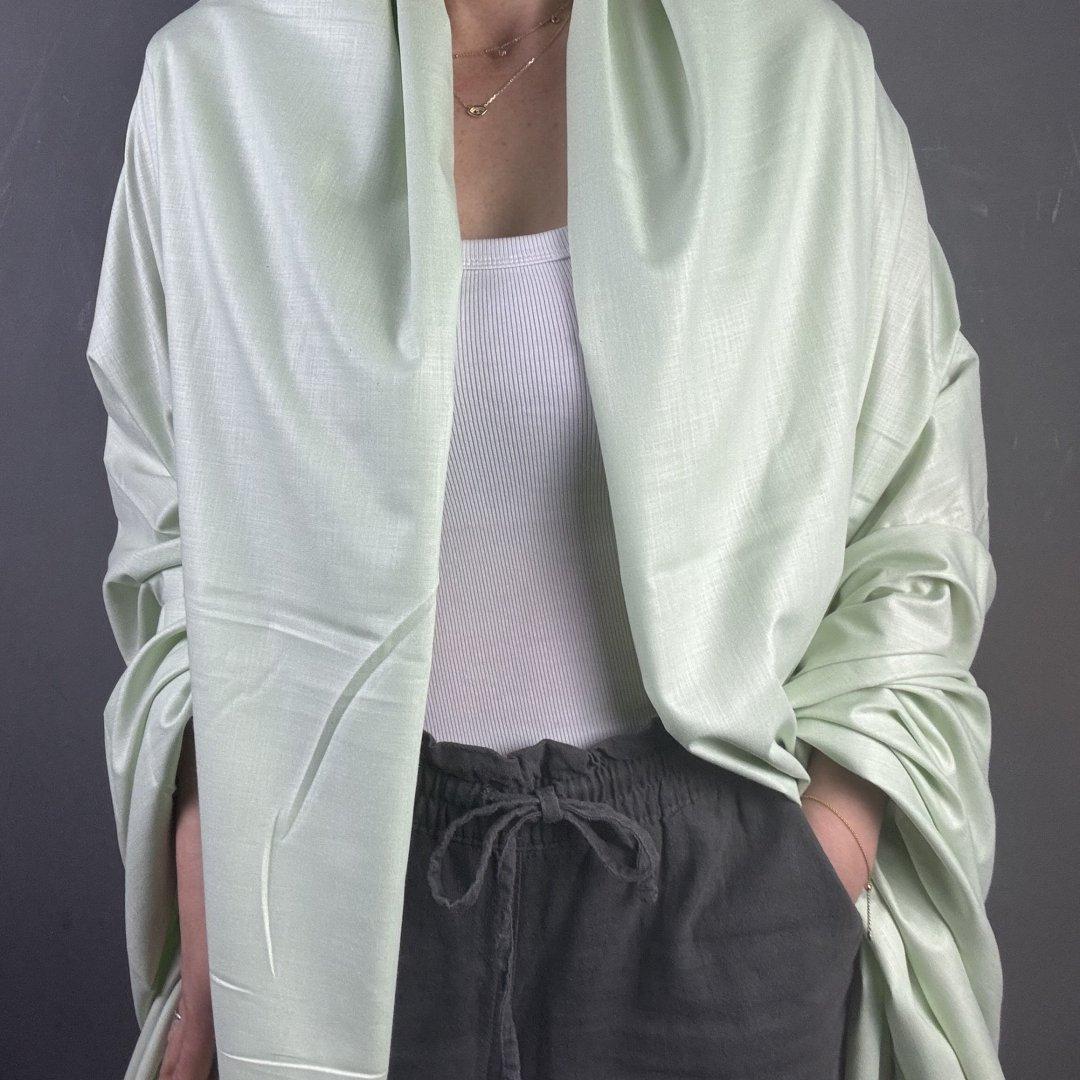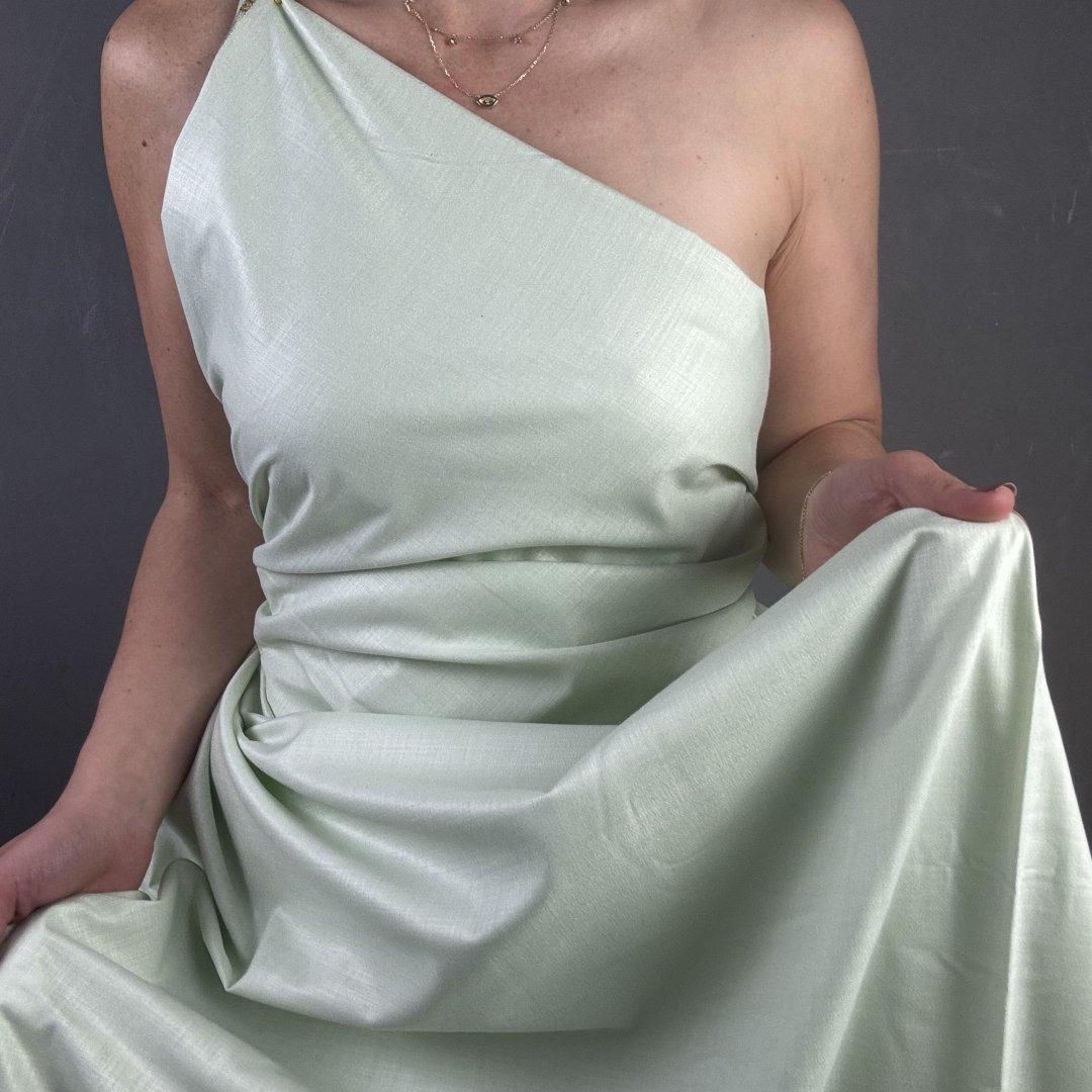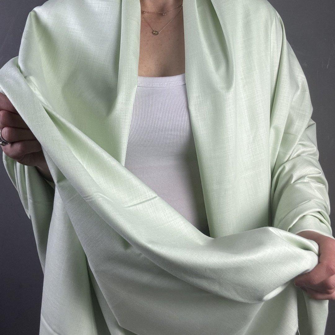 Pastel Green Linen, Rayon and Polyester is 140cm wide. This is a light weight plain cloth with a lot of drape and body. With a slight shine this cloth is easy to sew and will be a pleasure to wear for both day and evening wear.