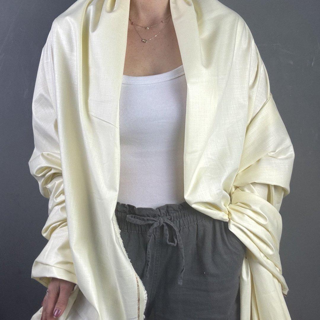 Pastel Lemon Linen, Rayon and Polyester is 140cm wide. This is a light weight plain cloth with a lot of drape and body. With a slight shine this cloth is easy to sew and will be a pleasure to wear for both day and evening wear.