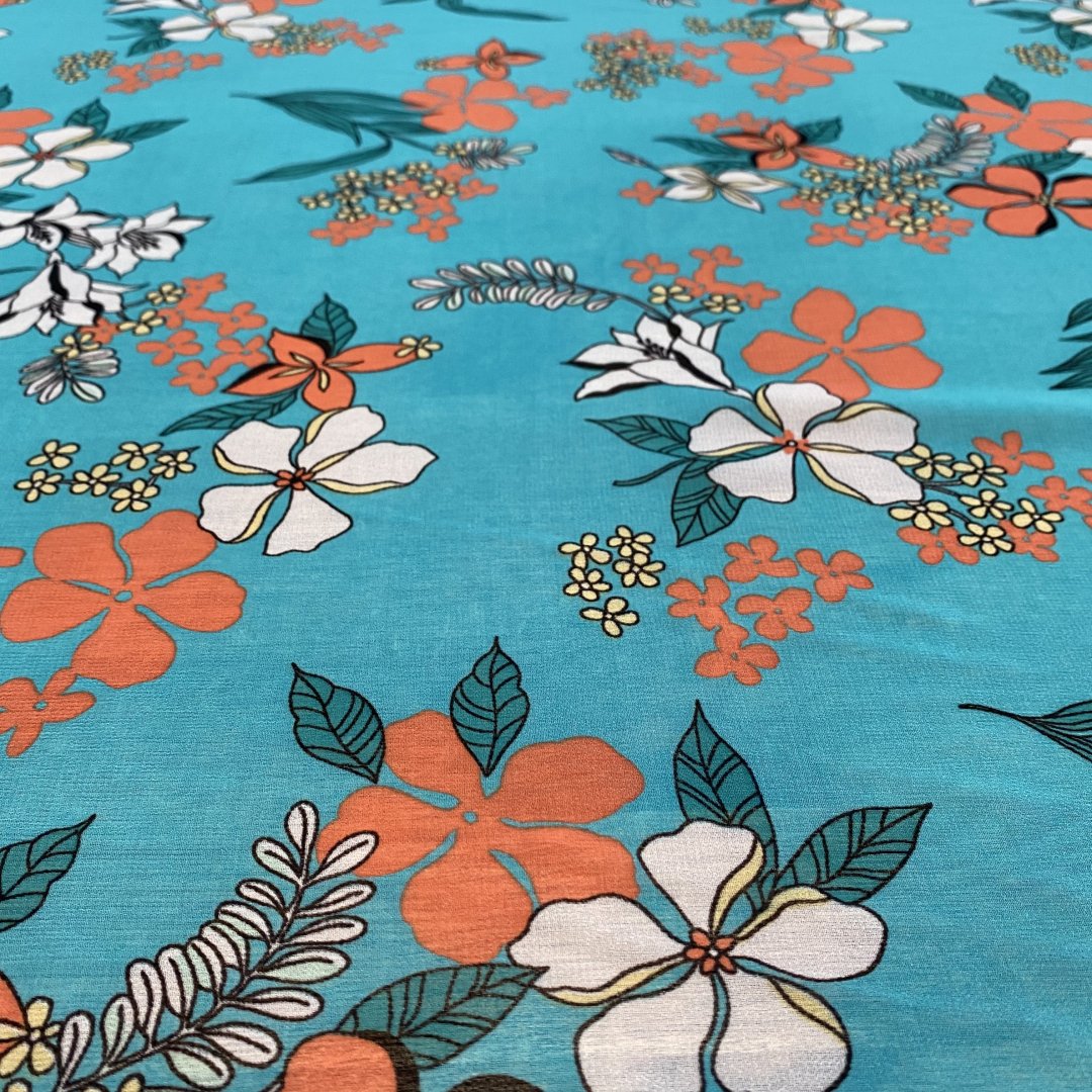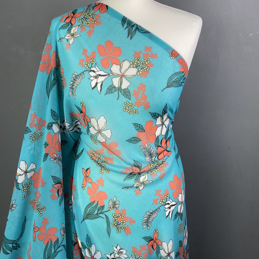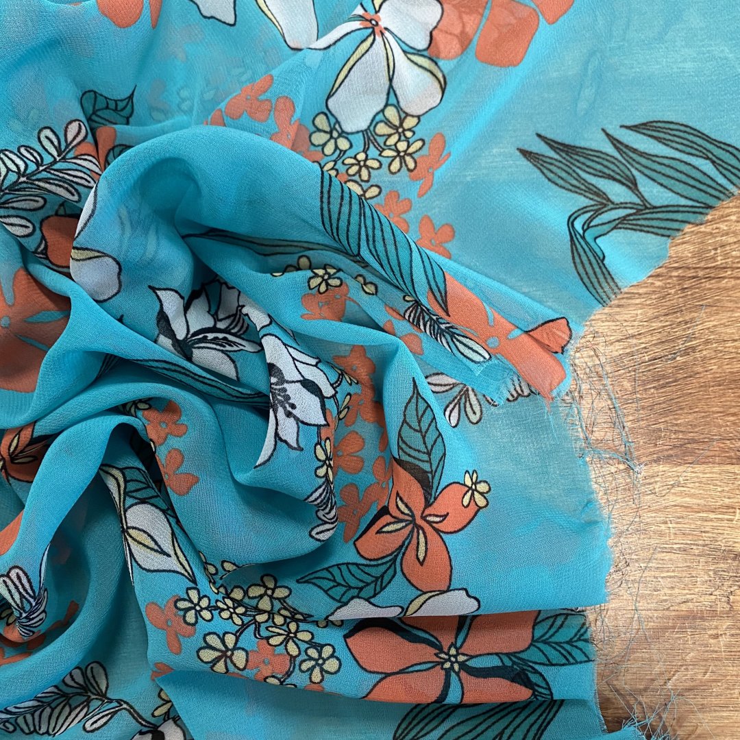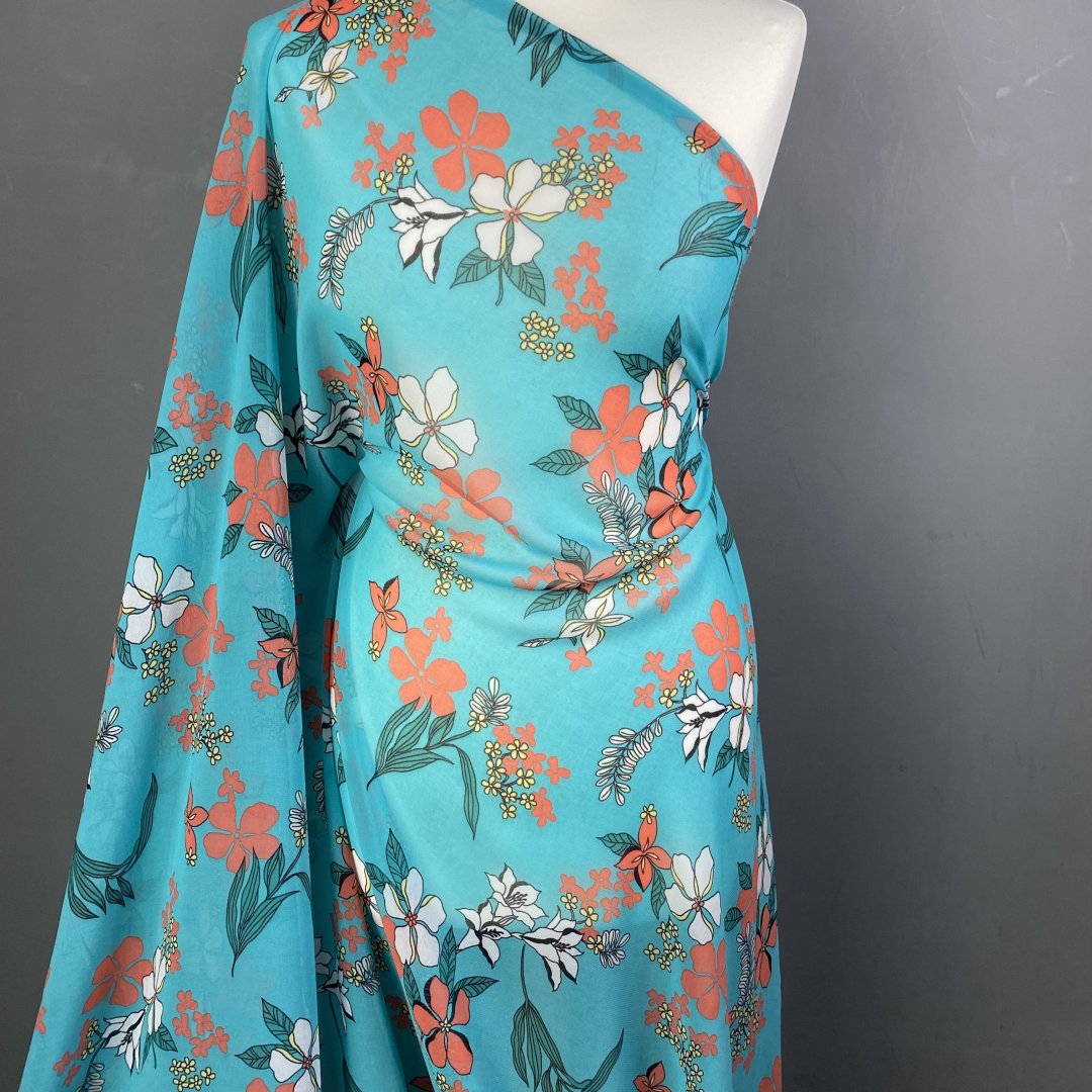 Polyester Chiffon Turquoise Tone is 145cm wide. This is a light weight transparent cloth with a fluid drape that is ideal for floaty summer dresses, tiered skirts, shirts, tops, kaftans and more. Beautiful colour tone provide a fresh summer feel to this polyester chiffon.