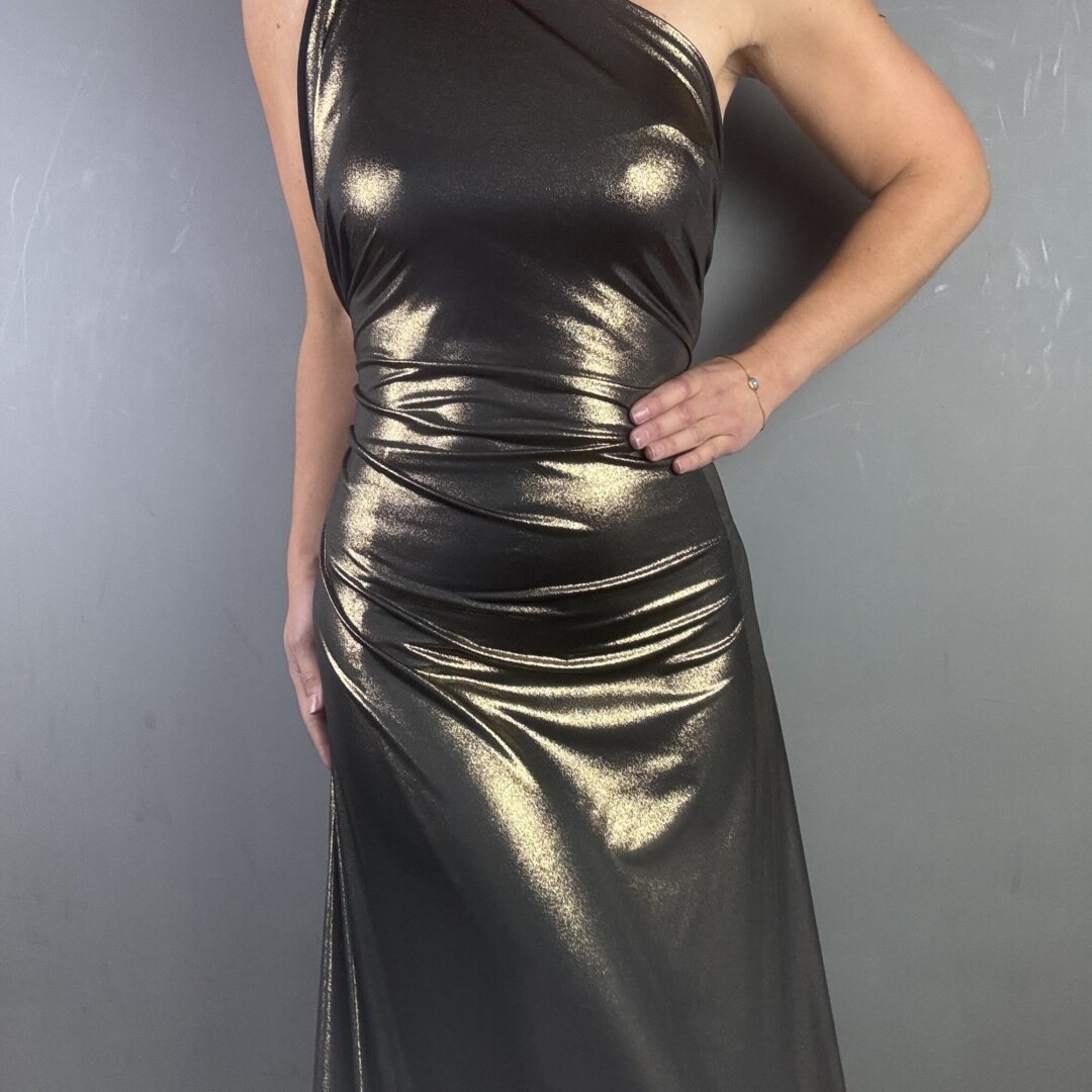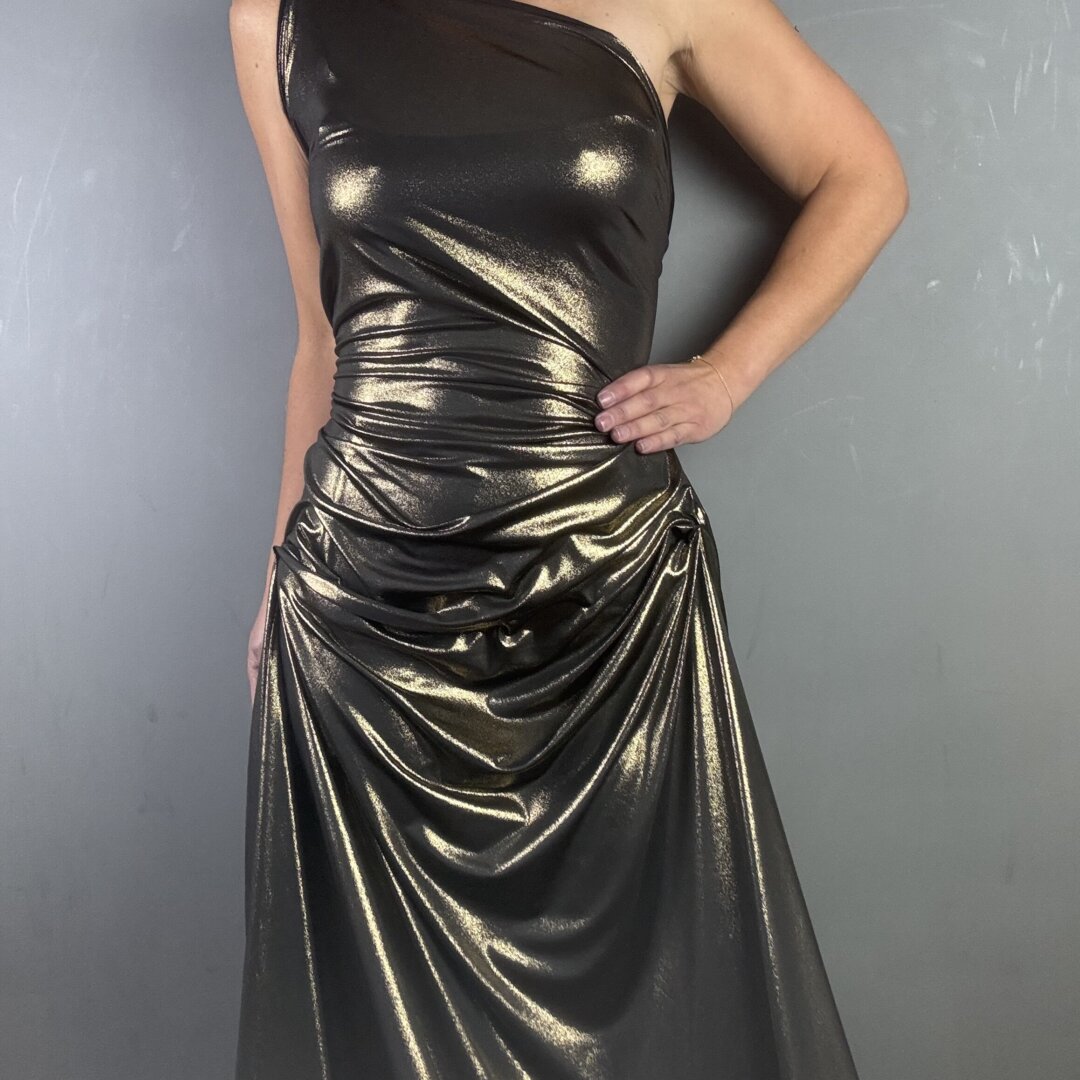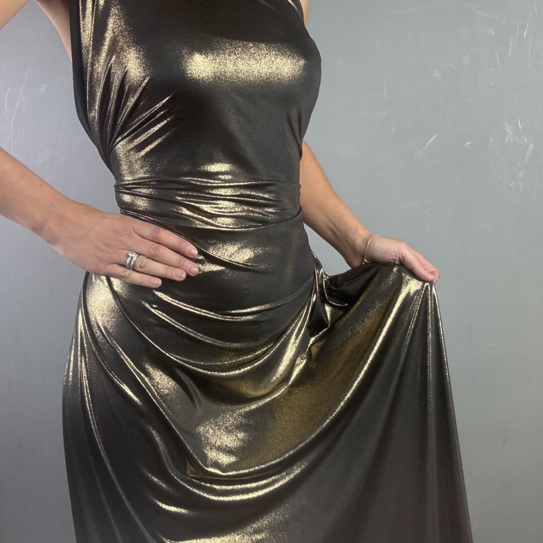 Our Polyester Jersey with Gold Foil is a lightweight, stretchy fabric with a beautiful fluid drape, measuring 150cm wide. This glamorous and dramatic fabric is perfect for creating statement skirts and dresses with plenty of drape, as well as cowl neck tops, leggings, dancewear, and more. Suitable for both day and evening wear, it adds a bold, eye-catching touch to any outfit. Available in another stunning colourway, this fabric is as versatile as it is striking. We recommend washing at 30 degrees with a colour catcher before sewing, as the dye may bleed slightly.