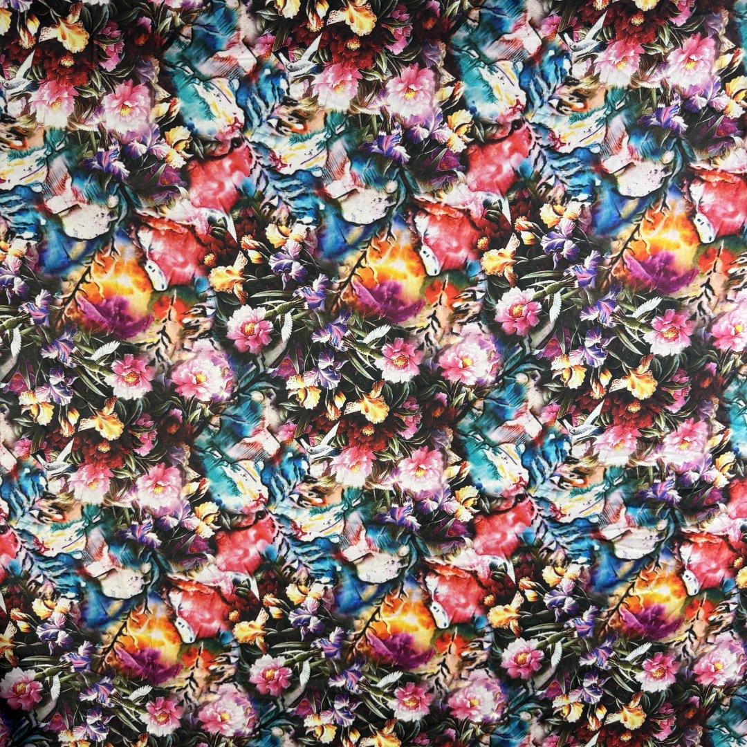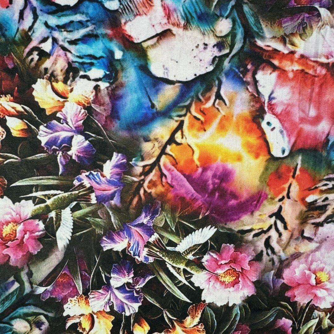 Pure Cotton Flower Magic is 148cm wide. This is a stunning quality pure cotton that is super soft and has a rayon like fluid drape. It’s bright and bold and will create that statement garment wear after wear.