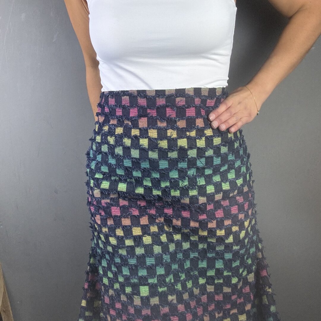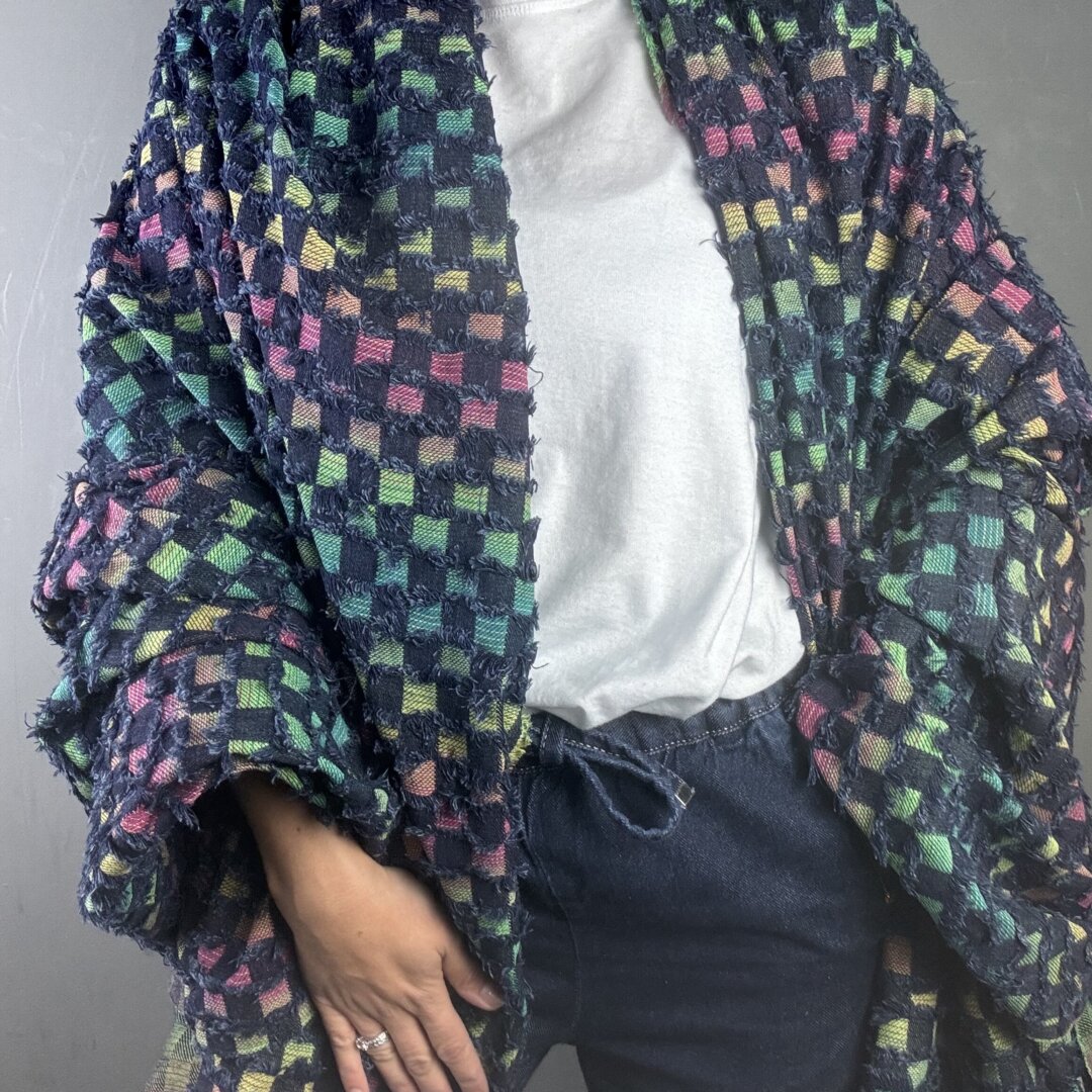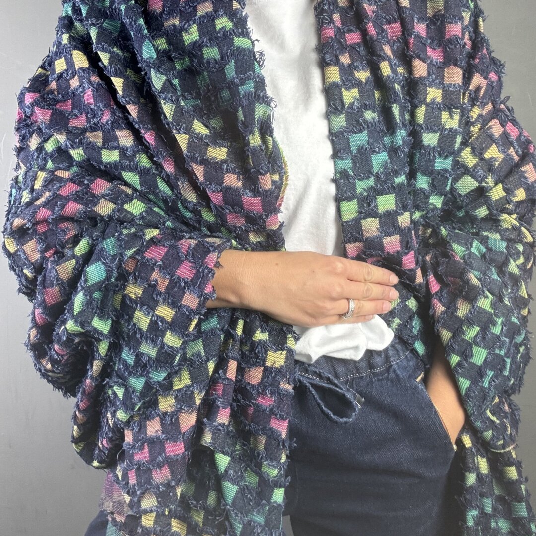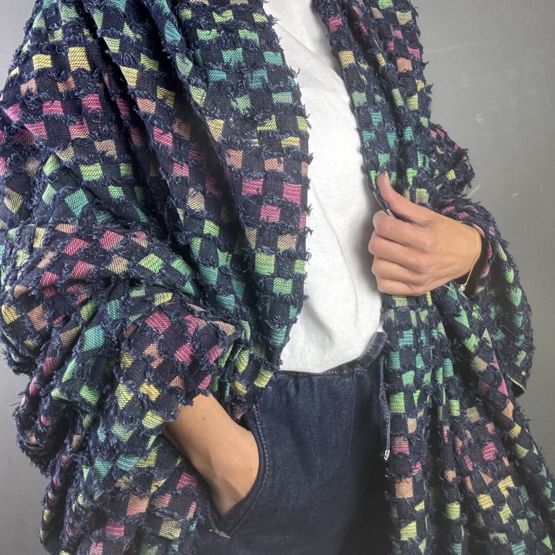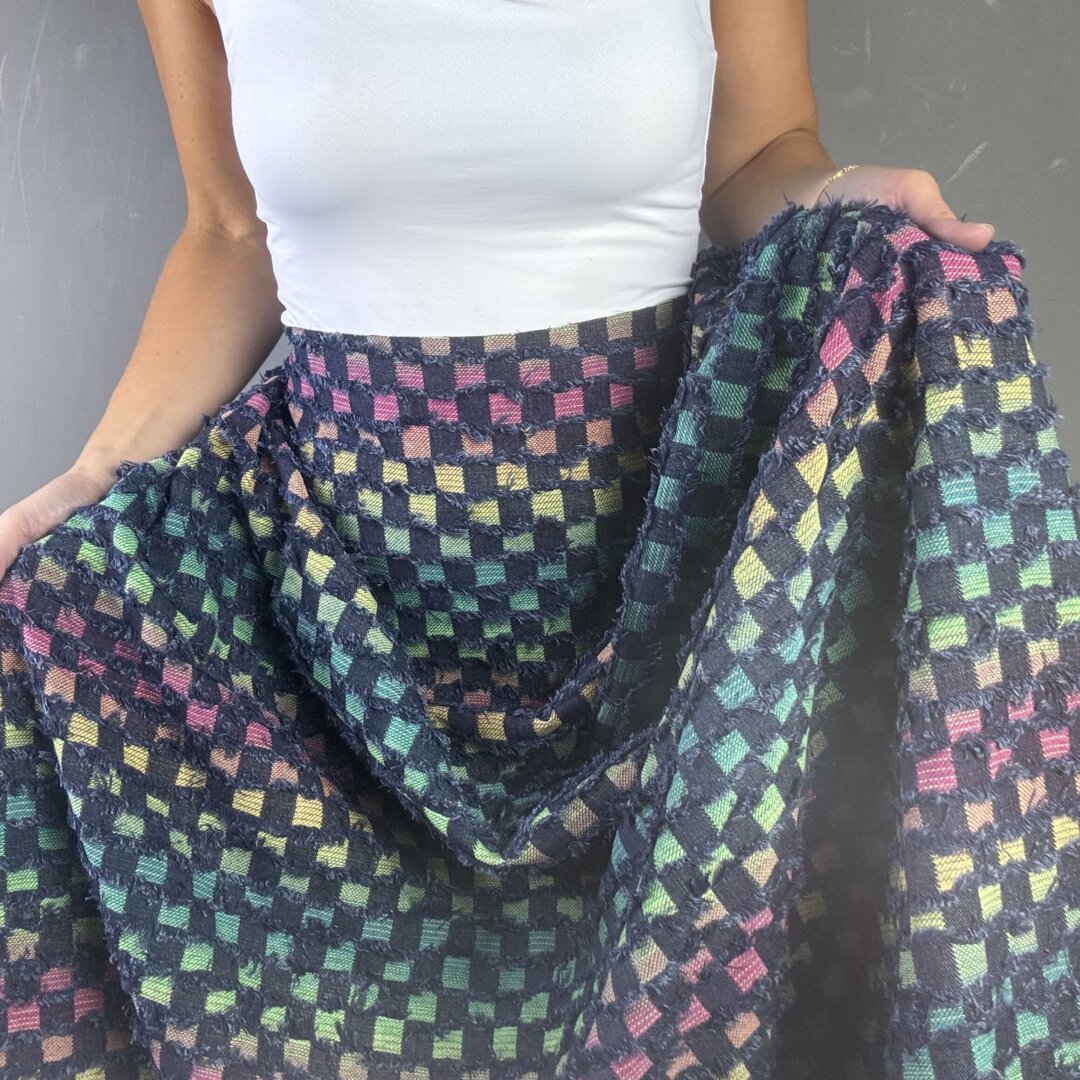 This medium-weight fabric offers the same versatility and structure you love, now with a deeper, edgier base that makes the rainbow threads pop even more. Perfect for crafting jackets, skirts, jeans, shackets, dresses, and beyond — it’s a dream for both statement pieces and everyday wear.