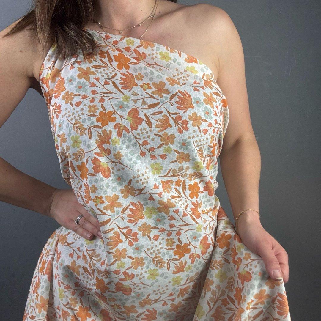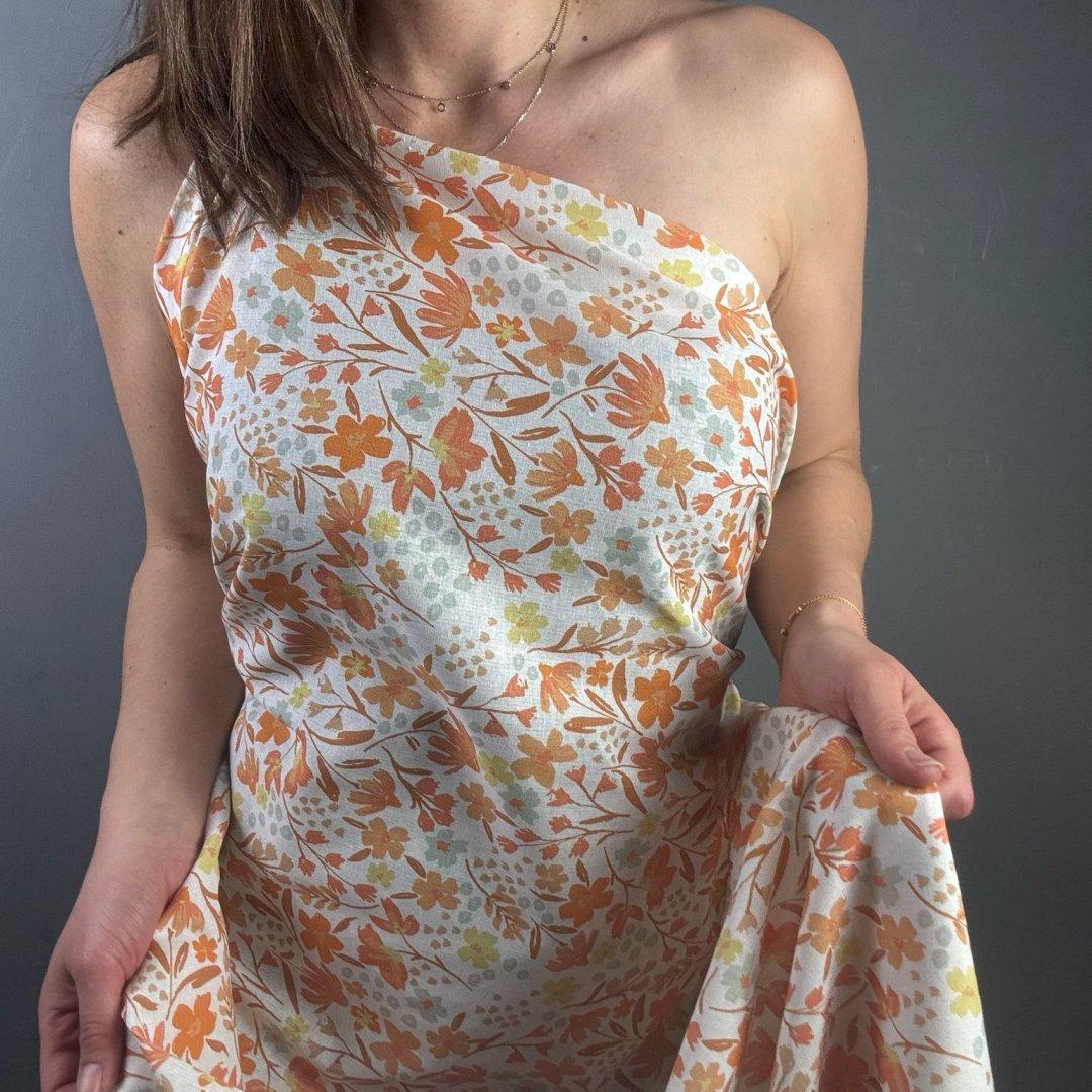 Ramie Linen and Cotton Orange Flower is 145cm wide. This is a new sampling we are very excited to show you. Ramie Linen and Cotton is a fantastic mix of two natural fibres that creates a breathable cloth.