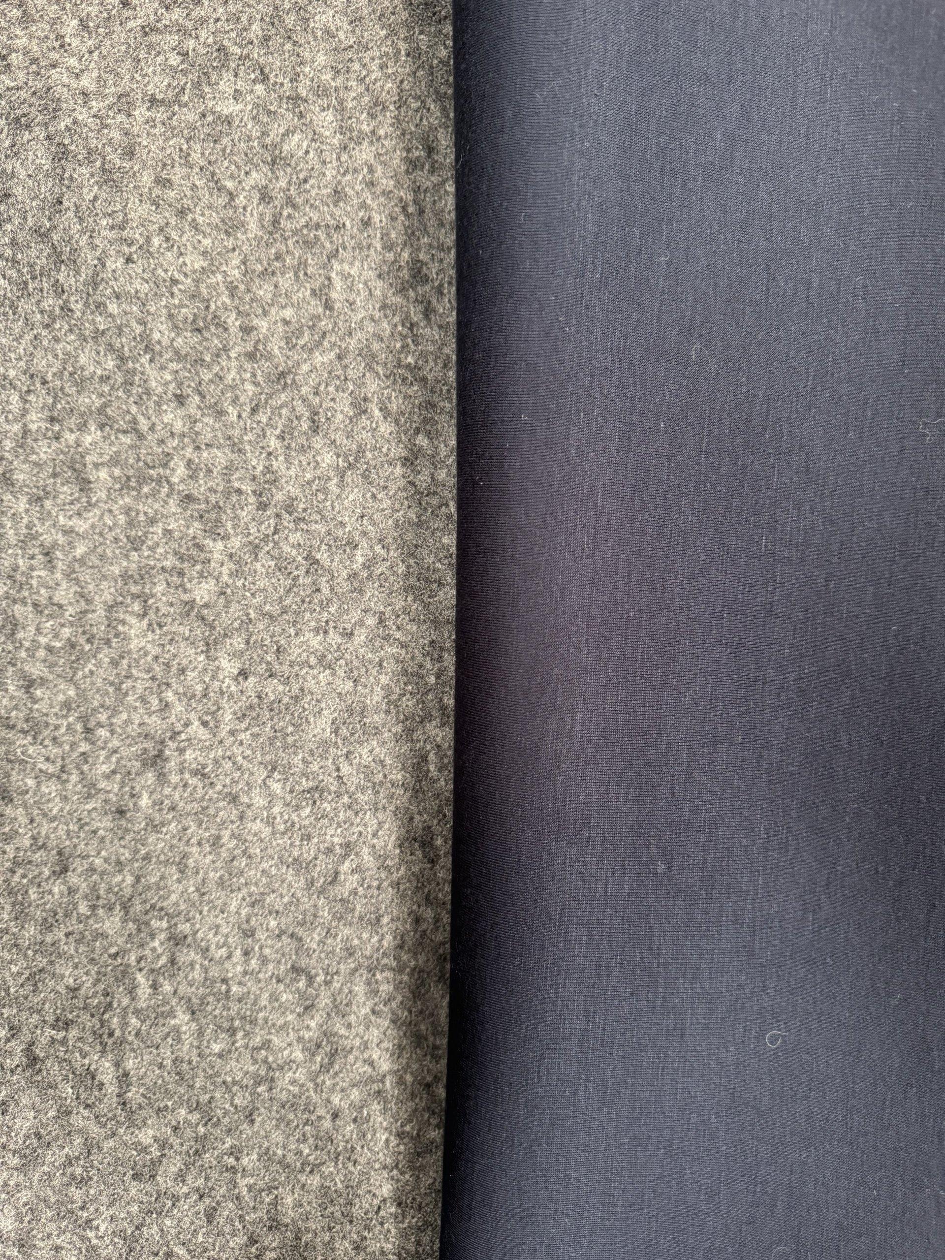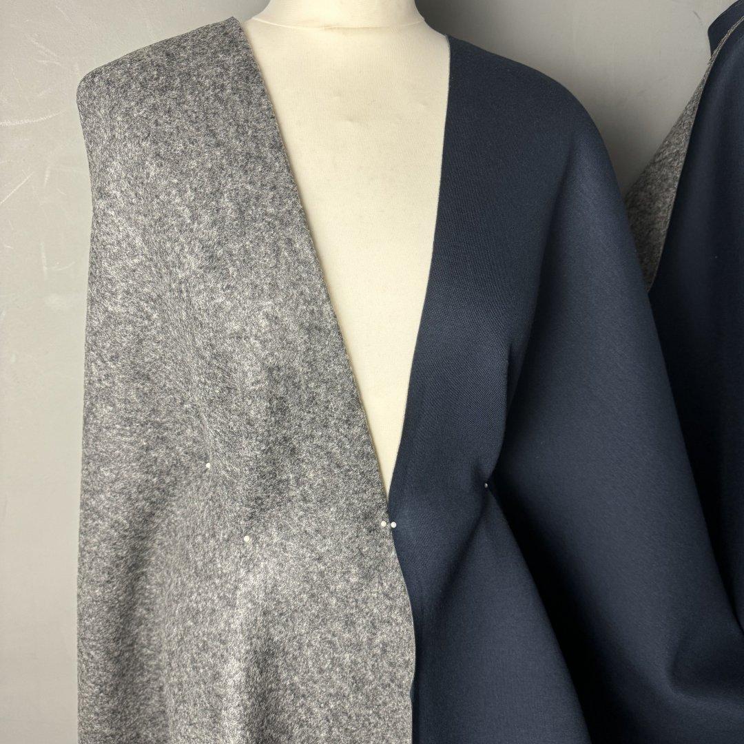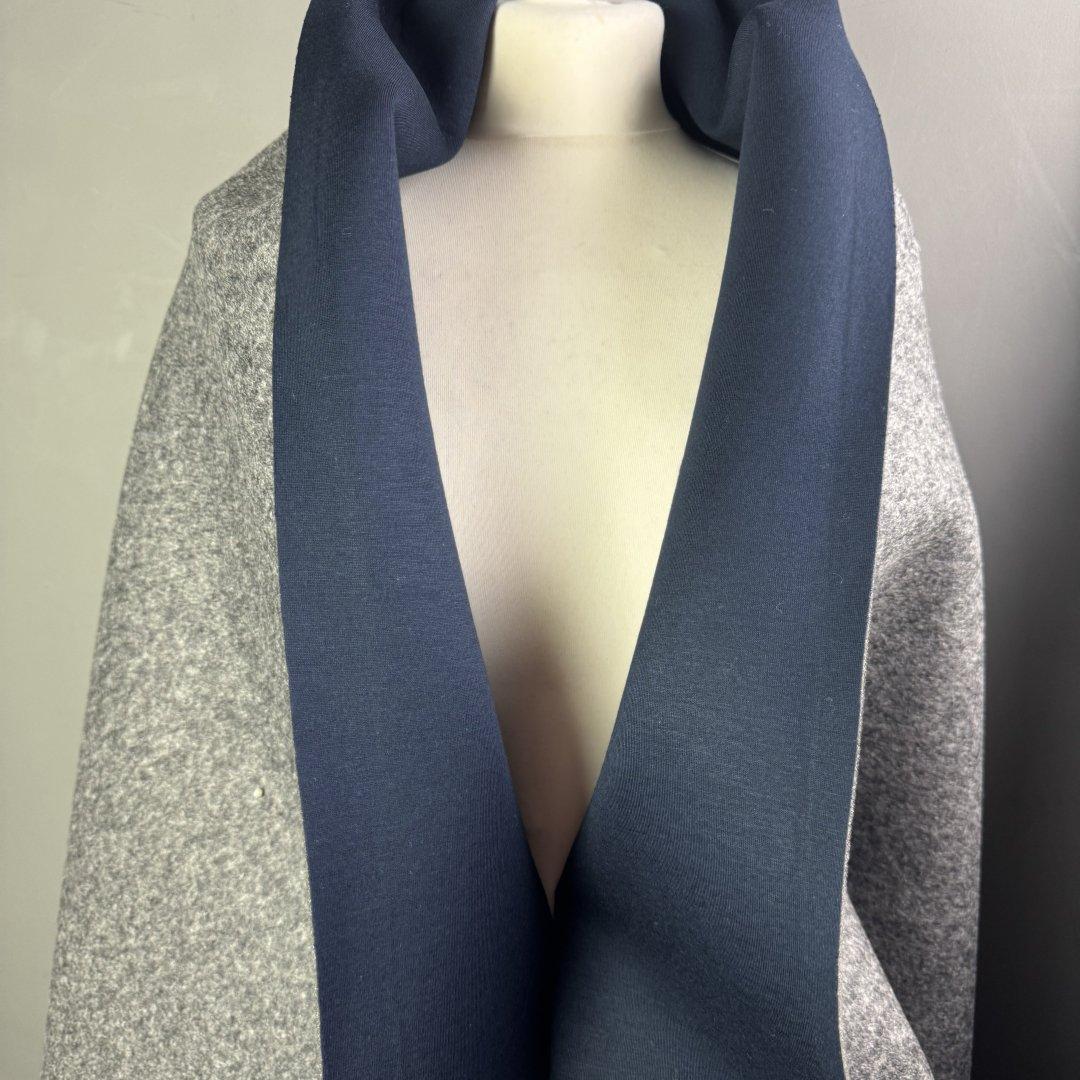 Reversible Bonded Jersey Wool Mix is 145cm wide. This is a fantastic reversible fabric. Dark mottled grey wool mix on one side of the cloth that has been bonded together with a navy jersey. There is a soft and spongy element to this fabric making it easy to sew and a pleasure to wear. This cloth also doesn’t fray!!!