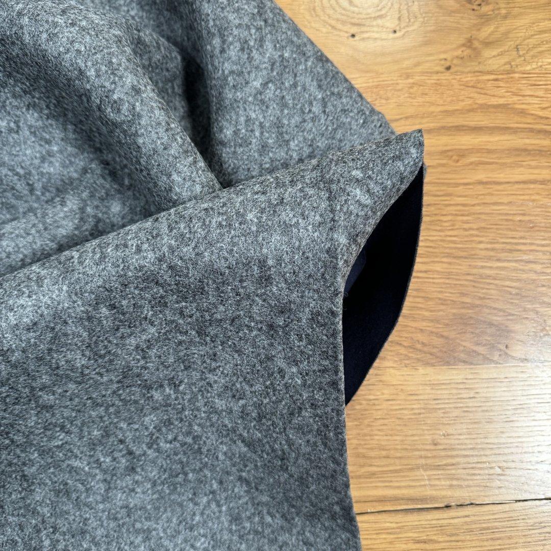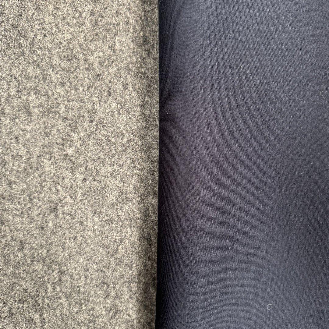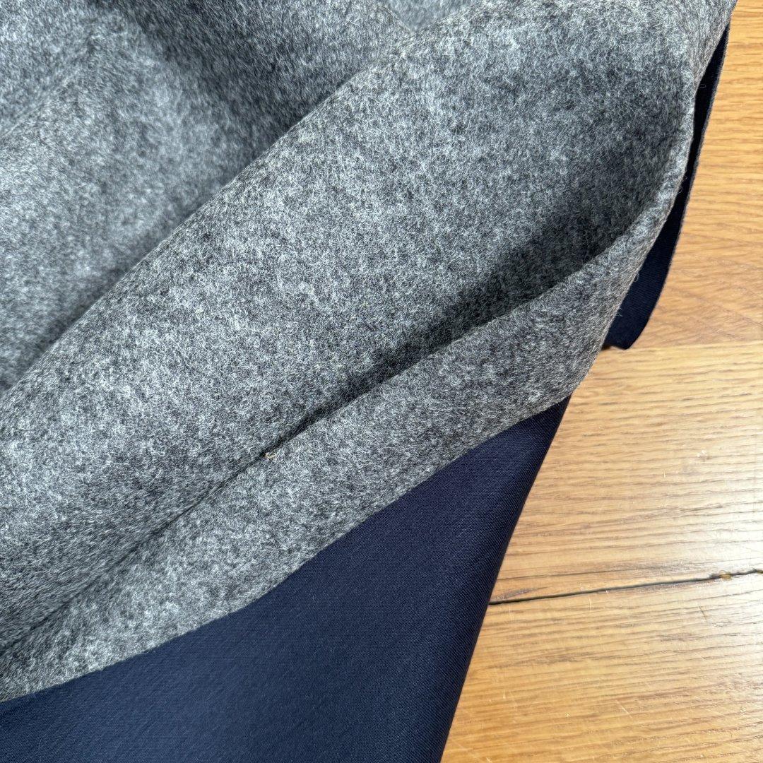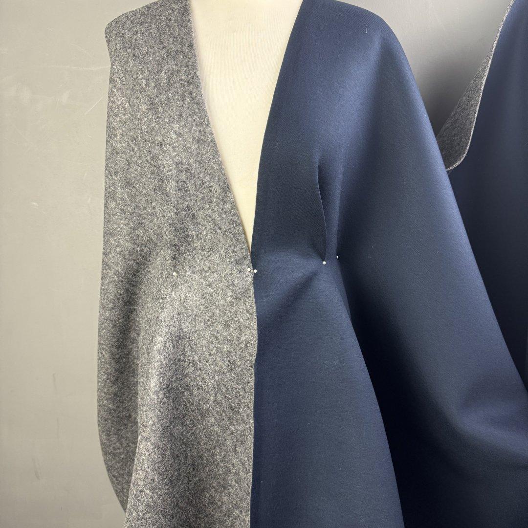 Reversible Bonded Jersey Wool Mix is 145cm wide. This is a fantastic reversible fabric. Dark mottled grey wool mix on one side of the cloth that has been bonded together with a navy jersey. There is a soft and spongy element to this fabric making it easy to sew and a pleasure to wear. This cloth also doesn’t fray!!!
