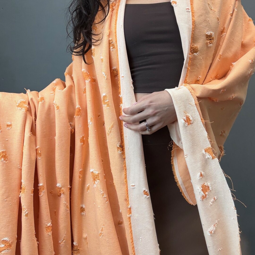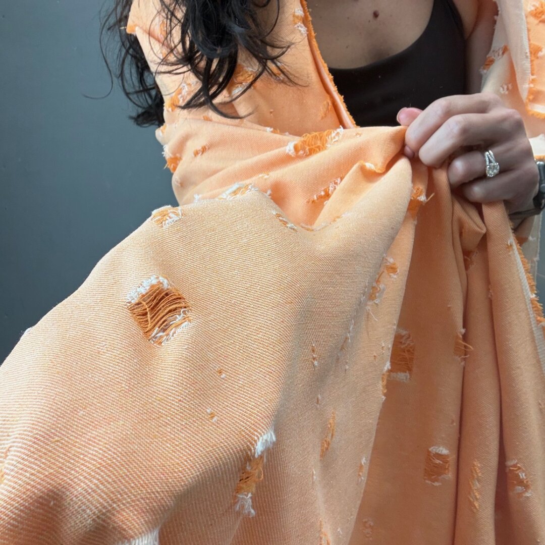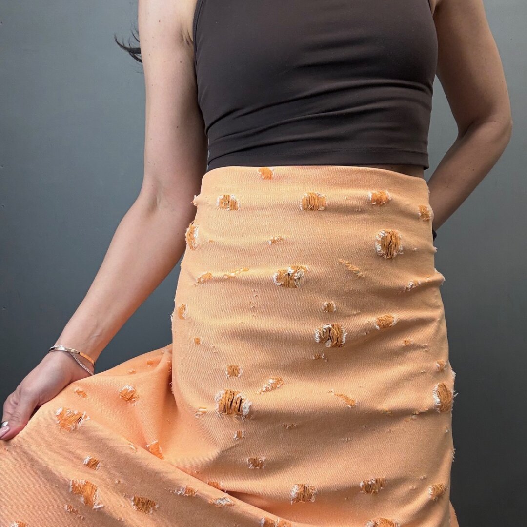 A spring/summer must-have, this versatile ripped orange denim is perfect for creating effortless everyday pieces. With a deeper orange shade on one side and a lighter tone on the other, it offers subtle contrast and added design interest.
