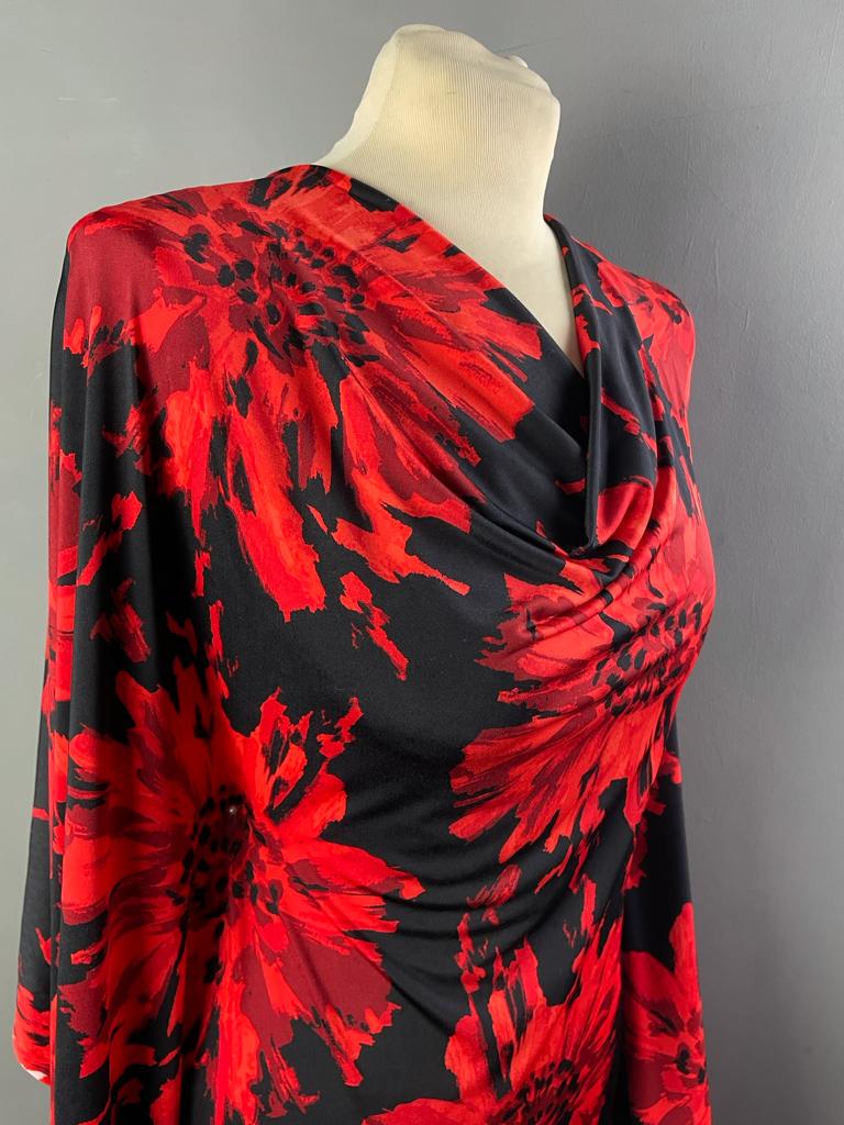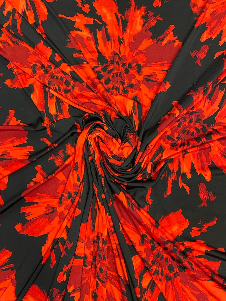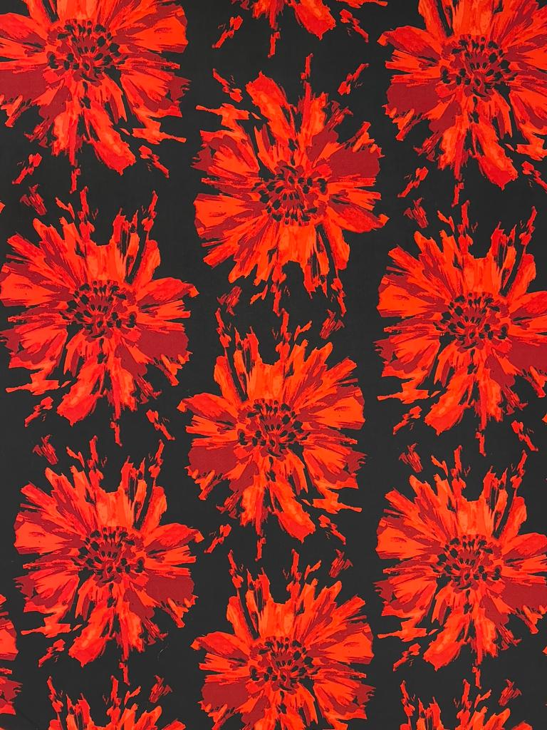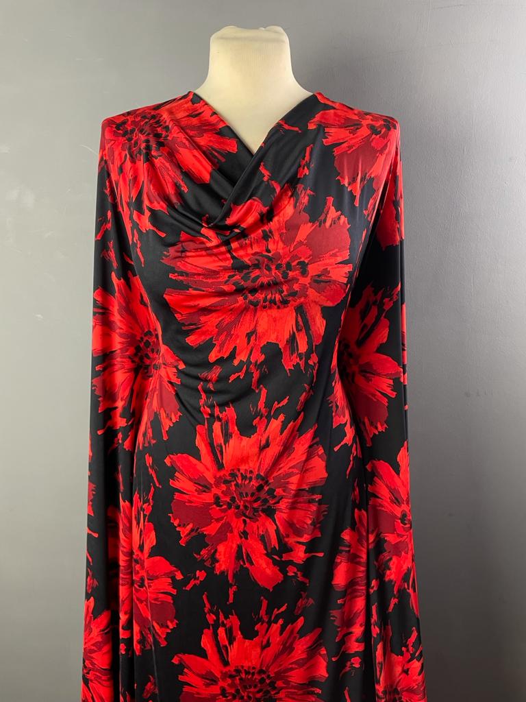 Ruby is a silky John Kaldor Jersey, 150cm wide. It has a black background with a very fluid drape to it.