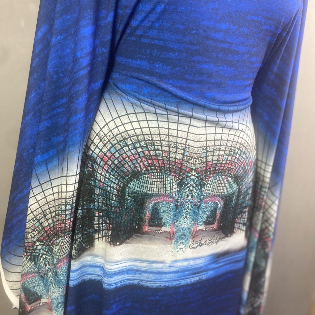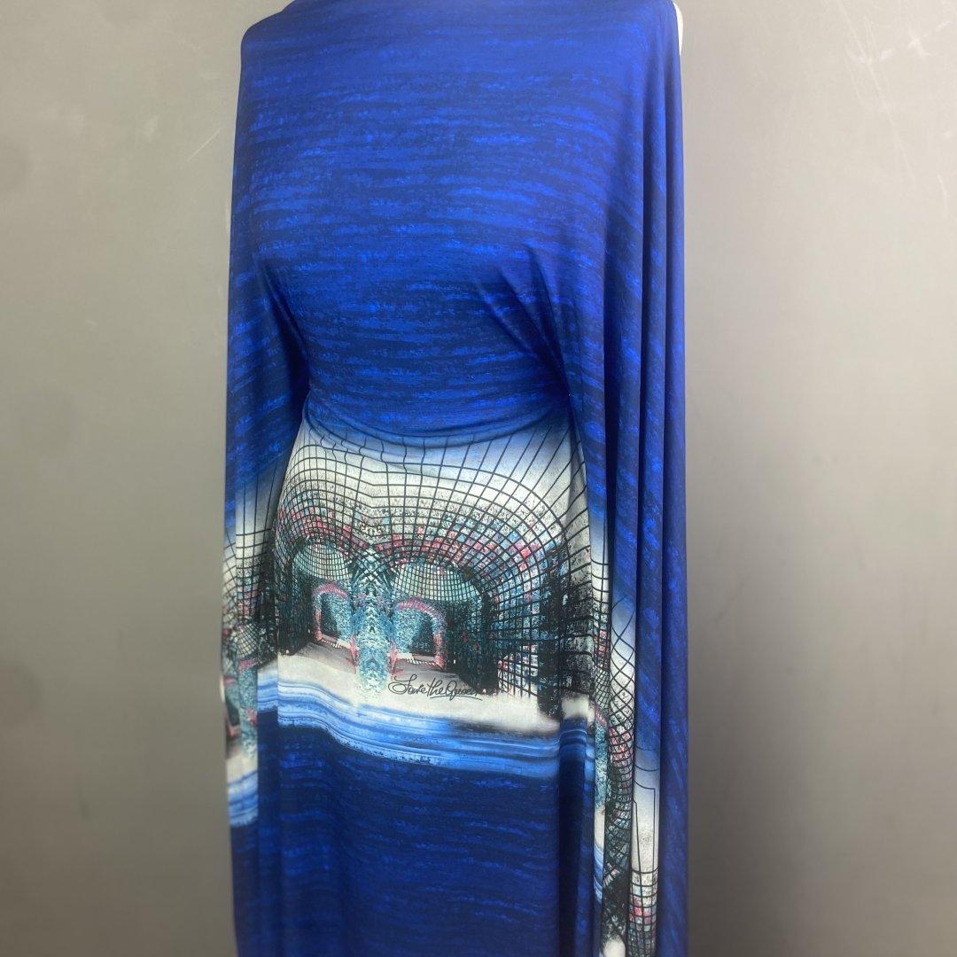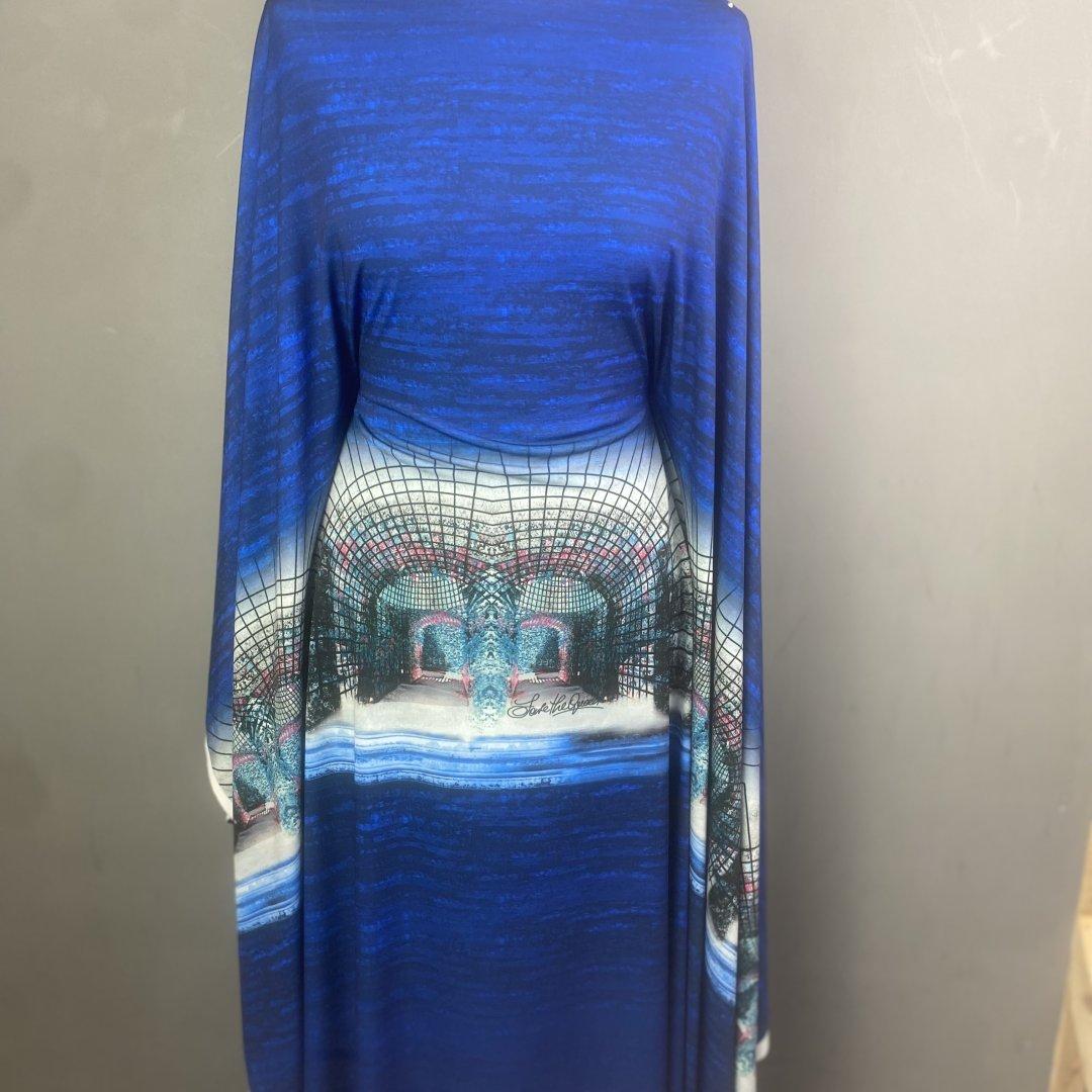 This is a fine jersey panel that is detailed and dramatic with fresh shades of blues. The design is bold and magical perfect for a simple shift dresses, wrap around dresses, swishy dresses, kaftans, beach wraps, maxi dresses, cover ups and more.
