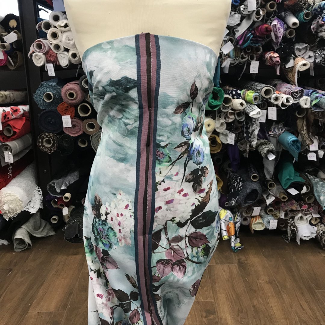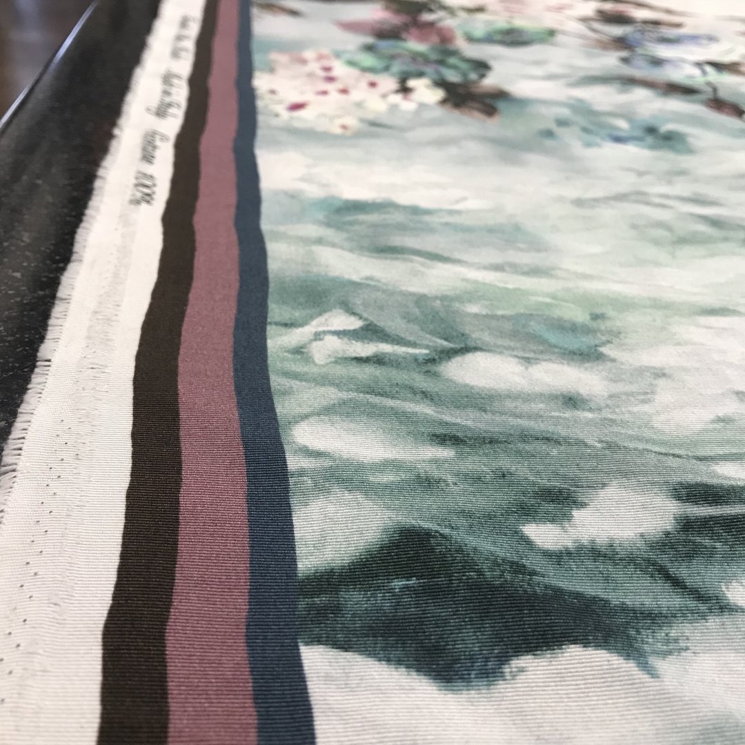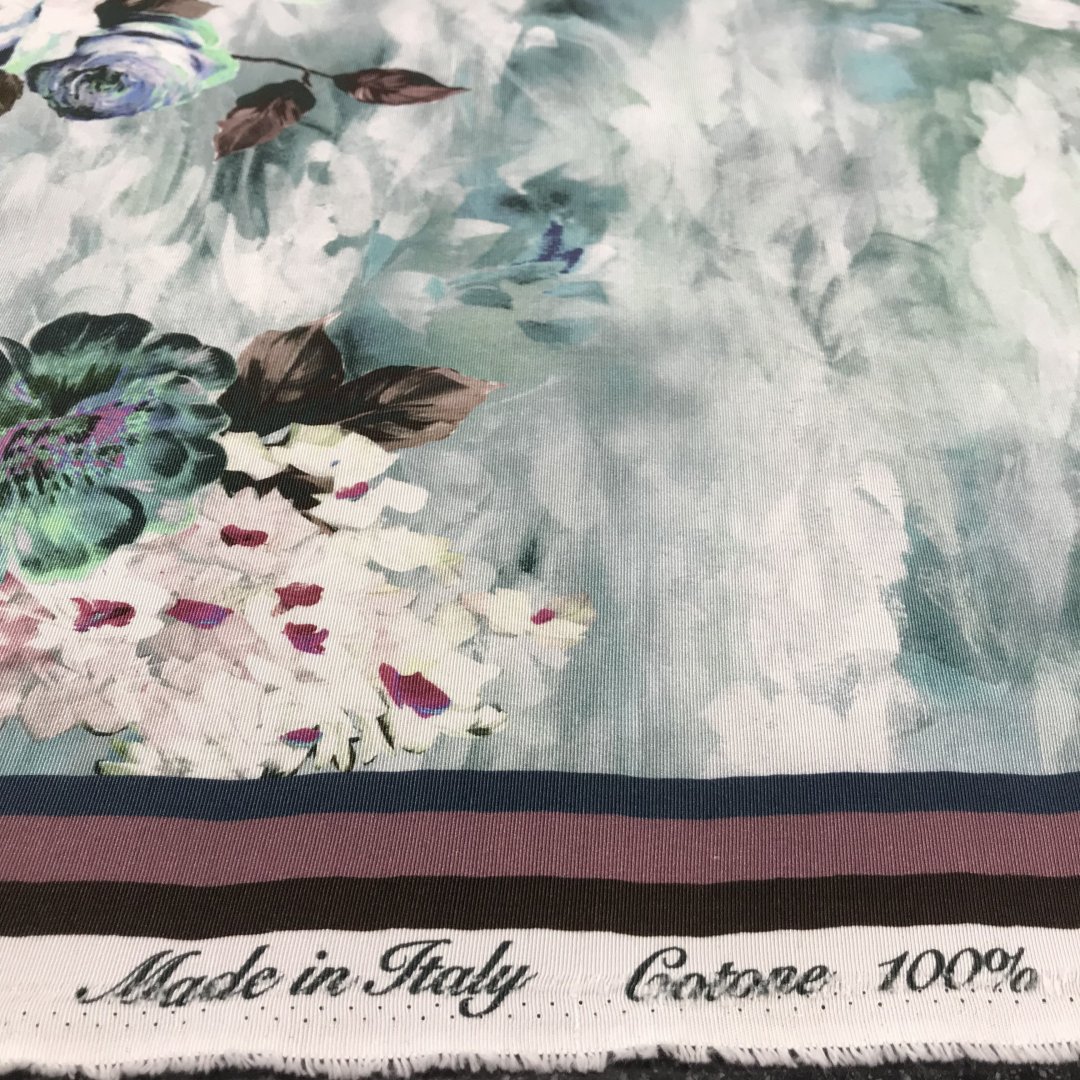 Sea of Flowers is a heavy weight cotton, 60″ wide (150cm). This heavily patterned romantic print is on a very easy to sew base cloth which is perfect for beginners. Try this fabric in V1486, B6015, M6706, or K3682. This Italian fabric is great for pleated skirts, circle skirts, shift dresses, structured jackets and so much more. This print has a small double border by each selvage given you the option to use or not. This is a truly beautiful cloth suitable for special occasions.