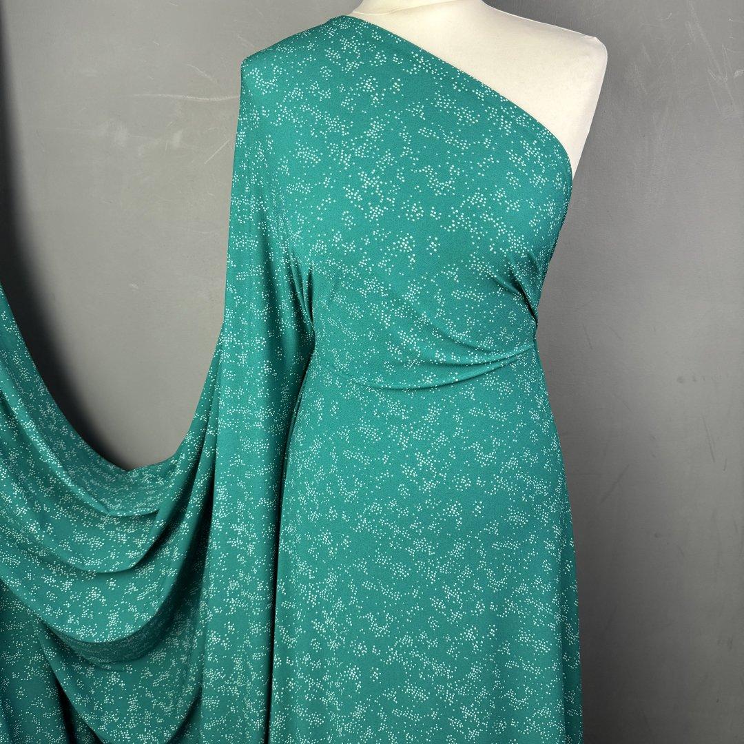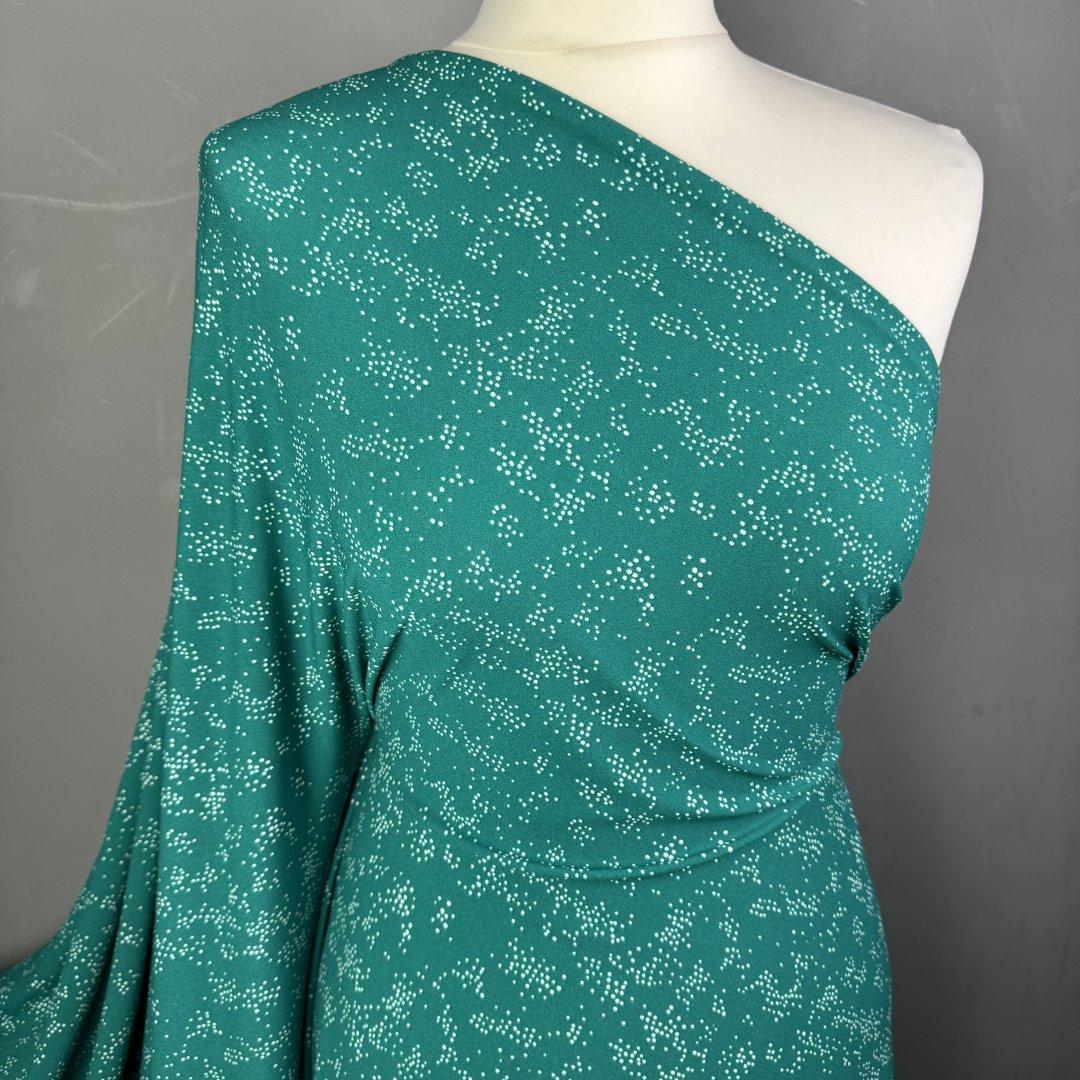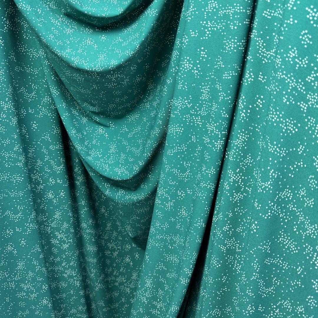 Speckle Green Jersey is 150cm wide. This is  light weight polyester elastane with a heavy drape. Our polyester elastane is a quality cloth that will offer swish and stretch to any garment. A bright and stunning yet simple print this fabric will create everyday garments such as, maxi dresses, floaty tops, wide leg trousers, leggings, wrap around dresses, wrap tops, jumpsuits and so much more.