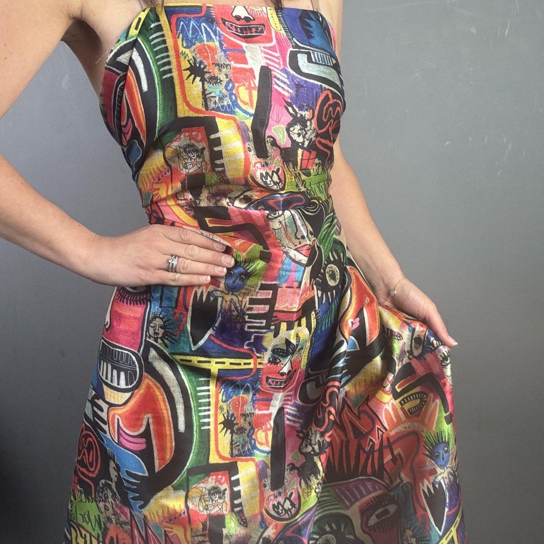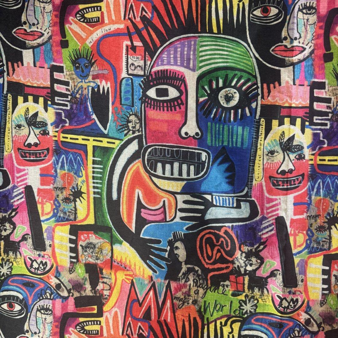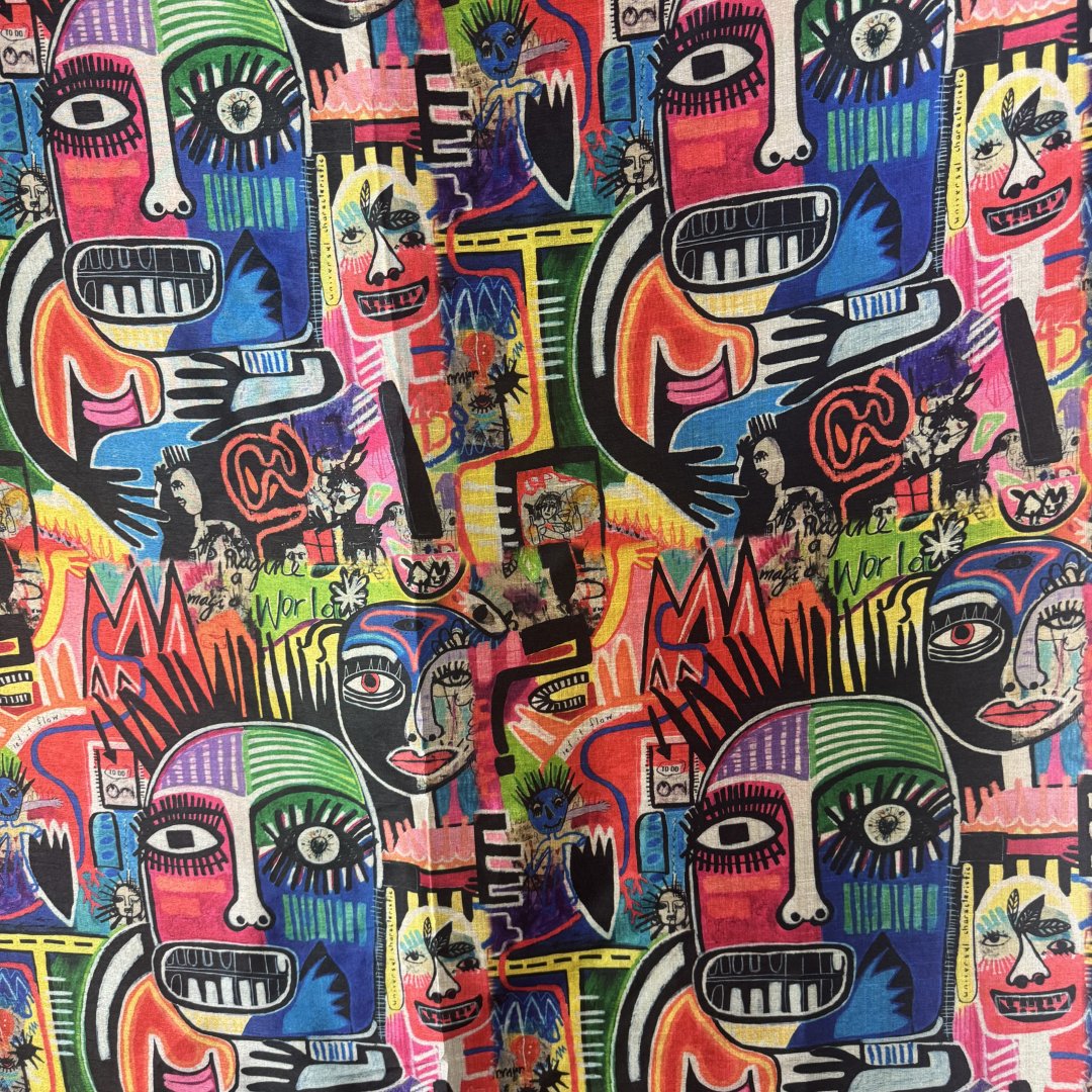 Street Graffiti Bamboo is 20% Bamboo / 40% Viscose / 40% polyester, 110cm wide. This is a light weight, breathable fabric that is perfect for shift dresses, circler skirts, pleated skirts, shirts, tunic tops, straight skirts, summer weight jackets, A- line skirts/ dresses and so much more.