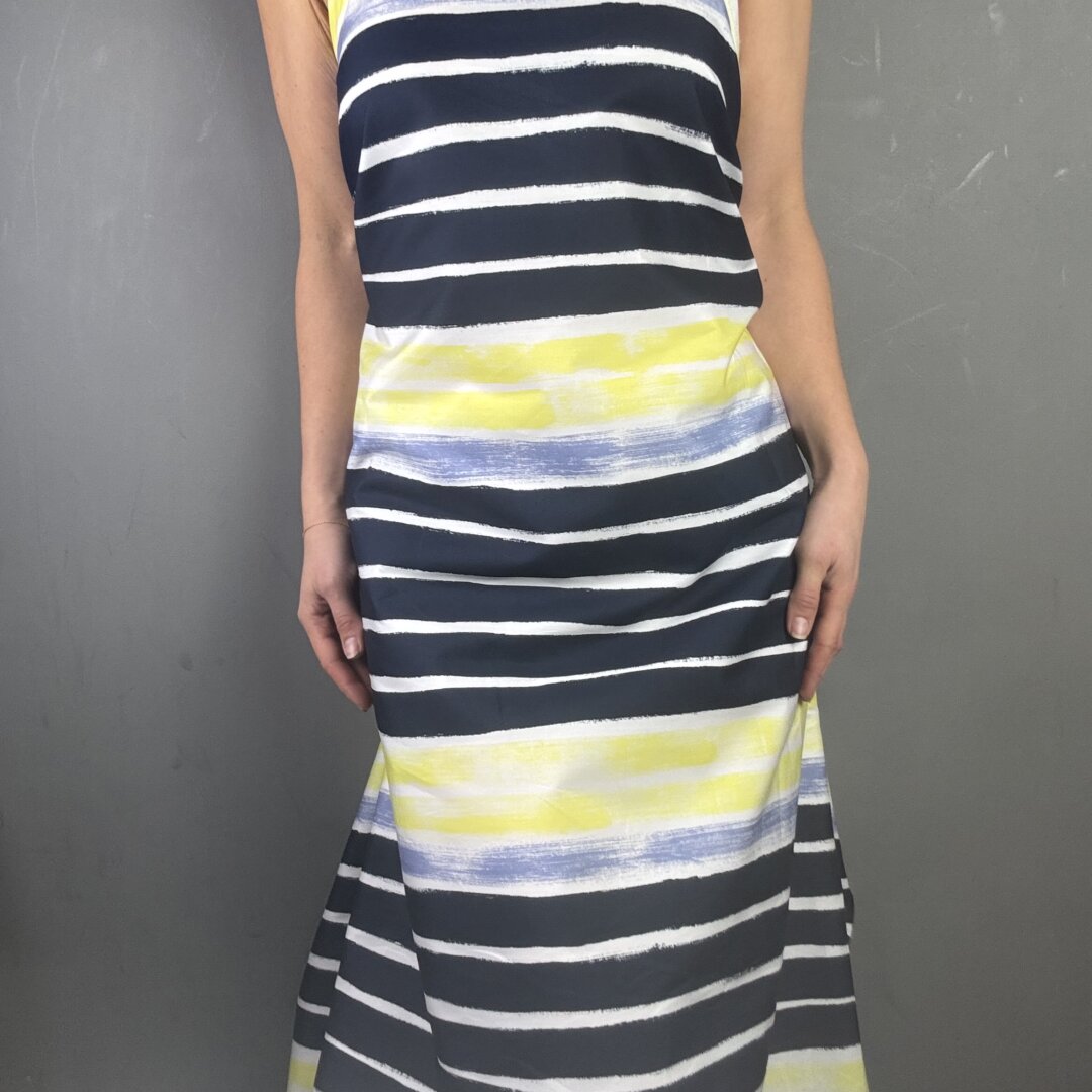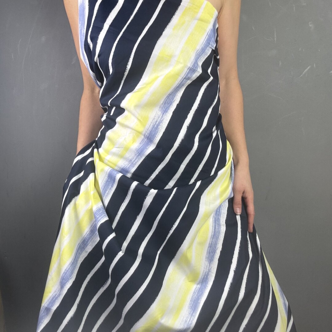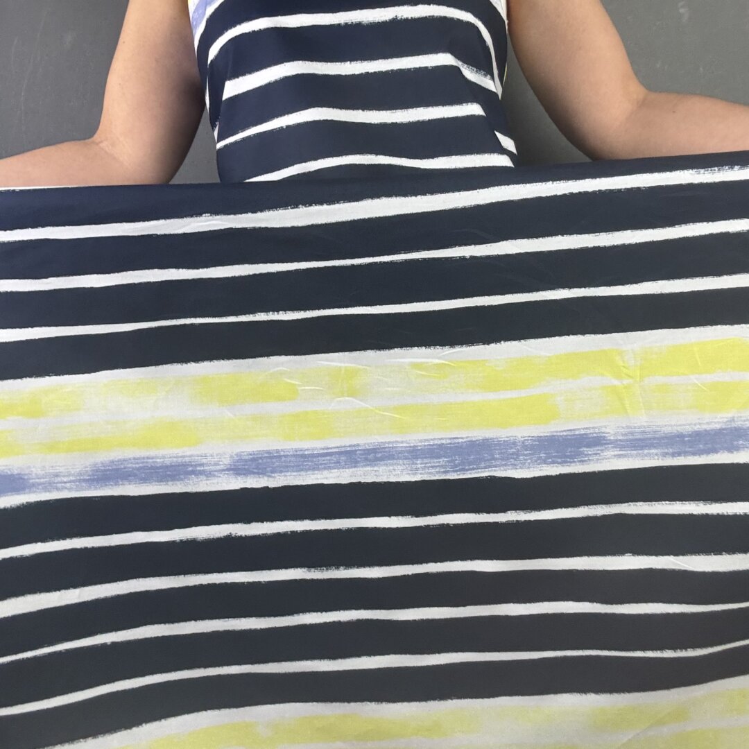 Stripes Of The Summer is 140cm wide. This is a crisp Italian cotton perfect for shift dresses, pleated skirts, shirts, light weight jackets and so much more. Stripes Of The Summer is a classic summer print keeping it chic and simple for your go to everyday garment.
