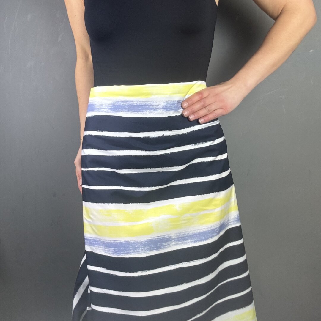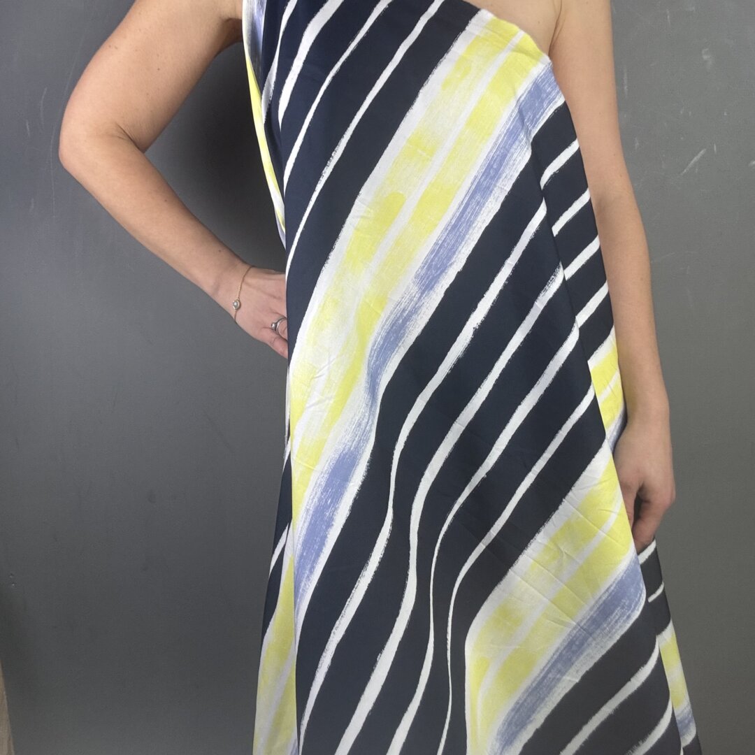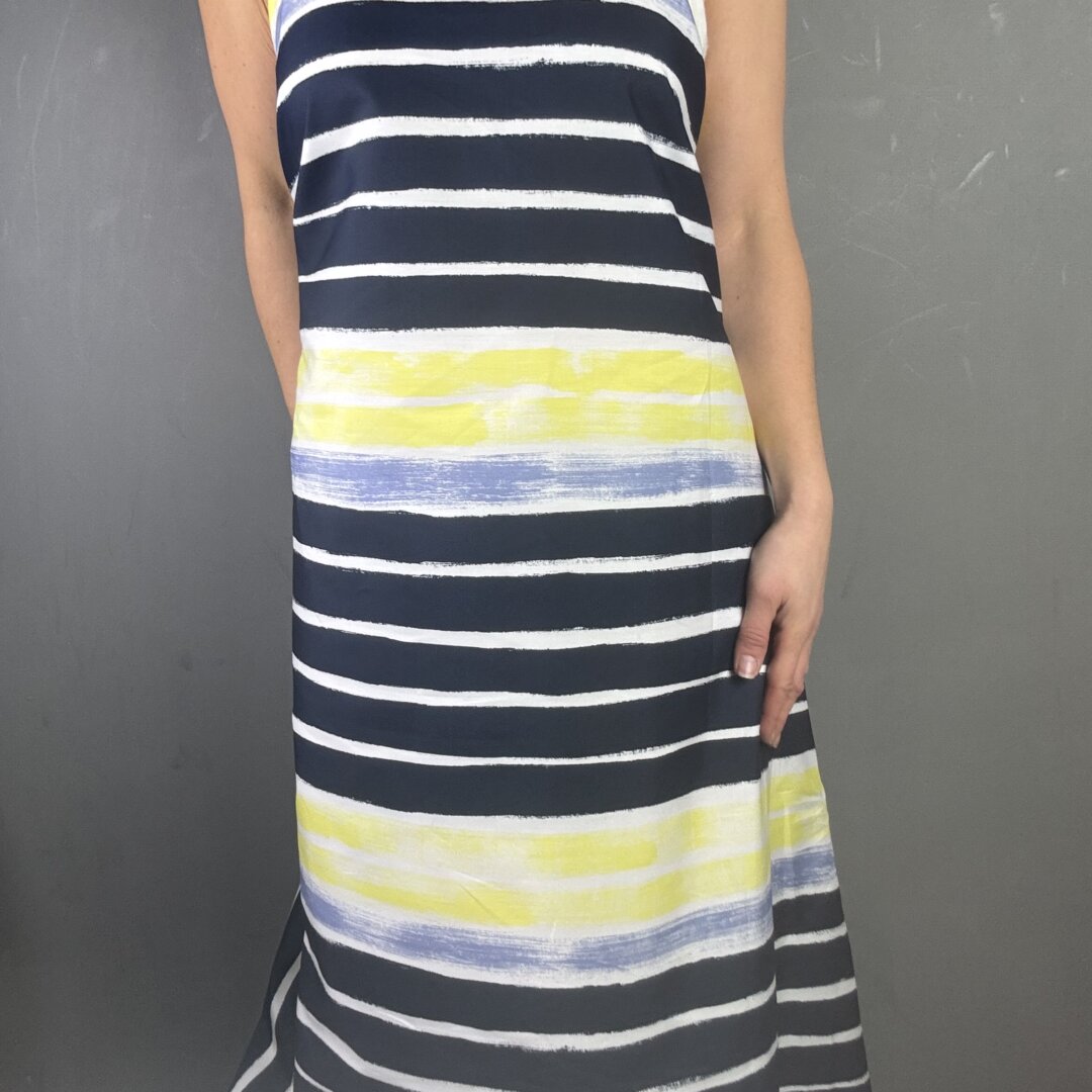 Stripes Of The Summer is 140cm wide. This is a crisp Italian cotton perfect for shift dresses, pleated skirts, shirts, light weight jackets and so much more. Stripes Of The Summer is a classic summer print keeping it chic and simple for your go to everyday garment.