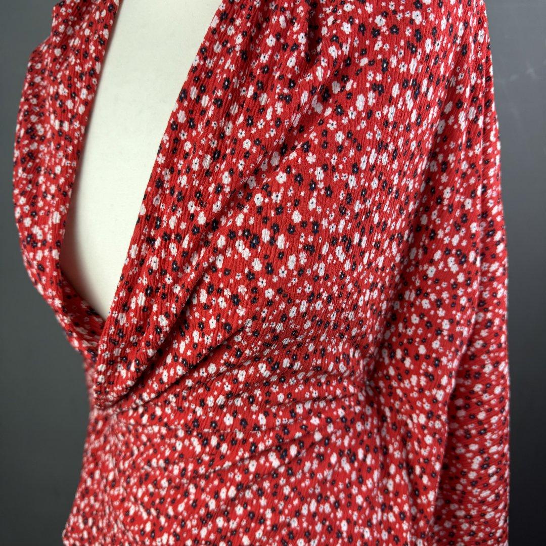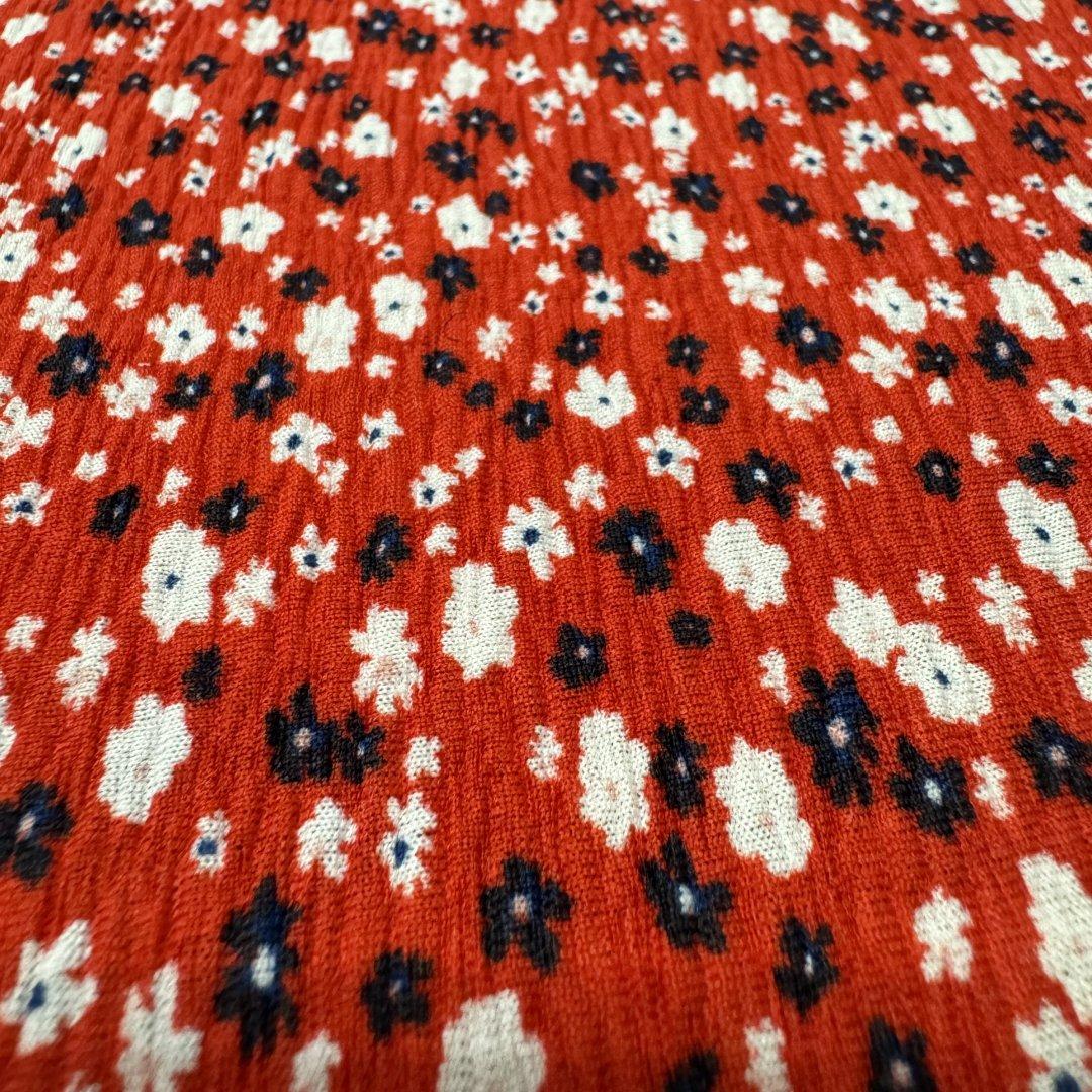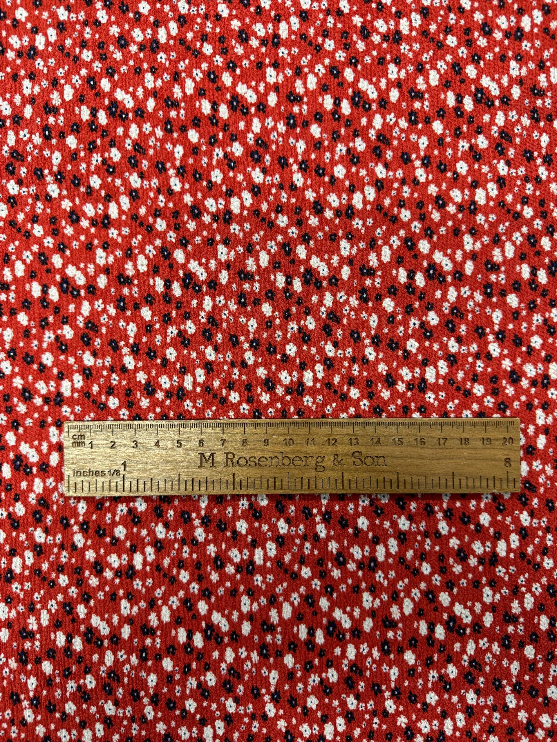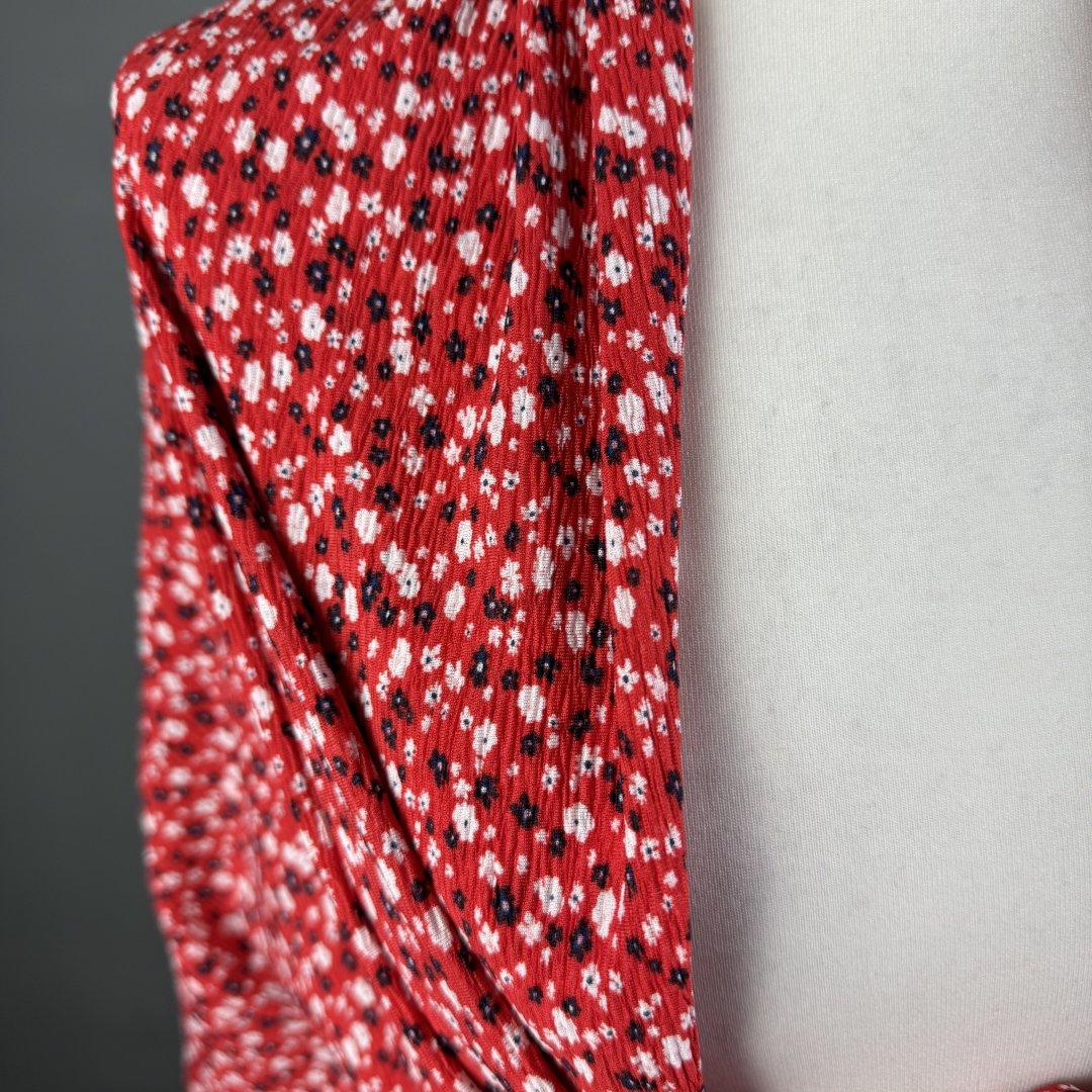 The Crinkle Jersey of The Spring Red is 150cm wide. This is a super soft, light weight, polyester elastane jersey. This fabric will create everyday garments that will see you through the spring and summer time seasons.