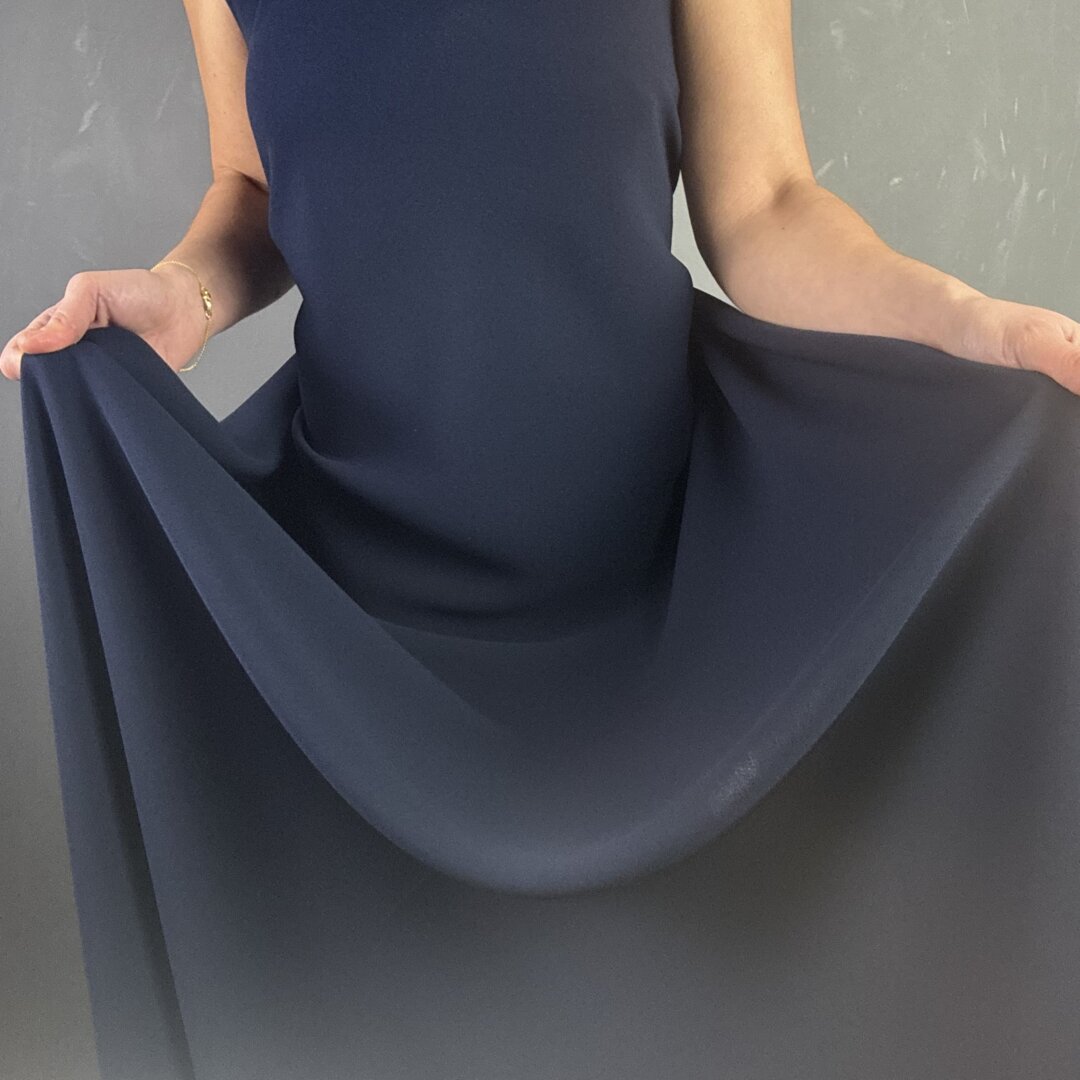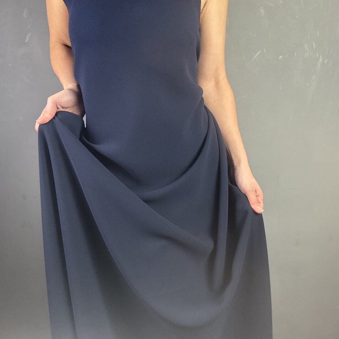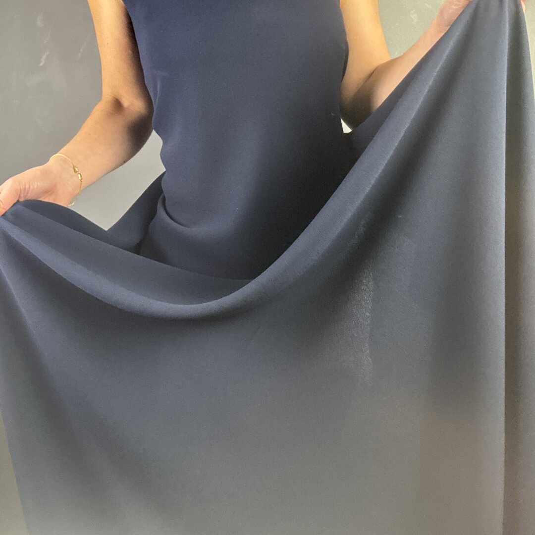 Triple Crepe in Navy is 60″ wide (150cm). This heavy weight polyester crepe is perfect for skirts, dresses, waterfall cardigans, trousers, duster jackets and more. Crepe is great for special occasions and evening wear. Triple Crepe is known for it’s heavy dramatic drape that is flattering for all body shapes. Try Maker’s Atelier brand new relaxed drawstring dress pattern for an individual statement look. This fabric is easy to sew and washes well on a 30 degrees wash. Please note this fabric will fray and comes in other colour ways! This fabric appears darker in real life. Click Here to Mix & Match with a beautiful silk.