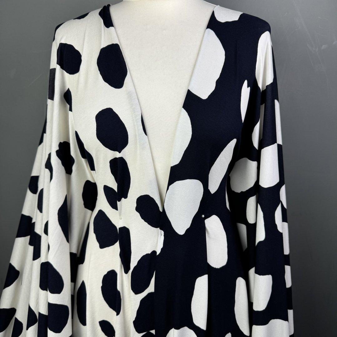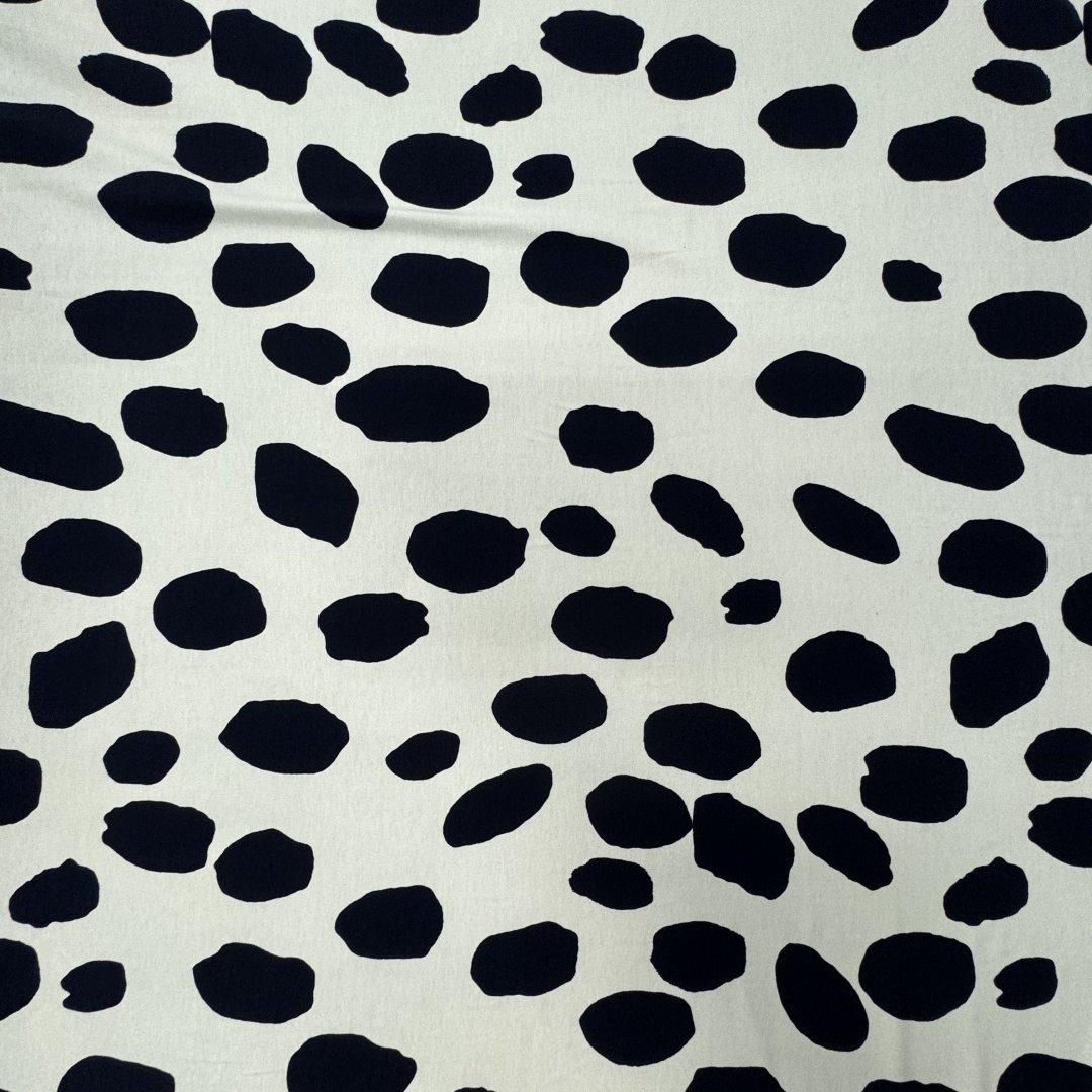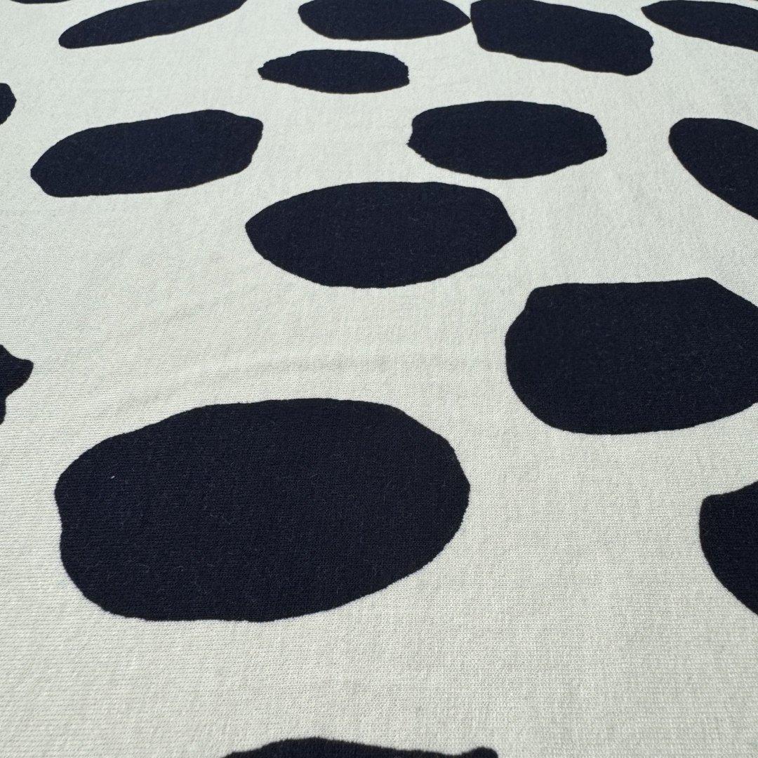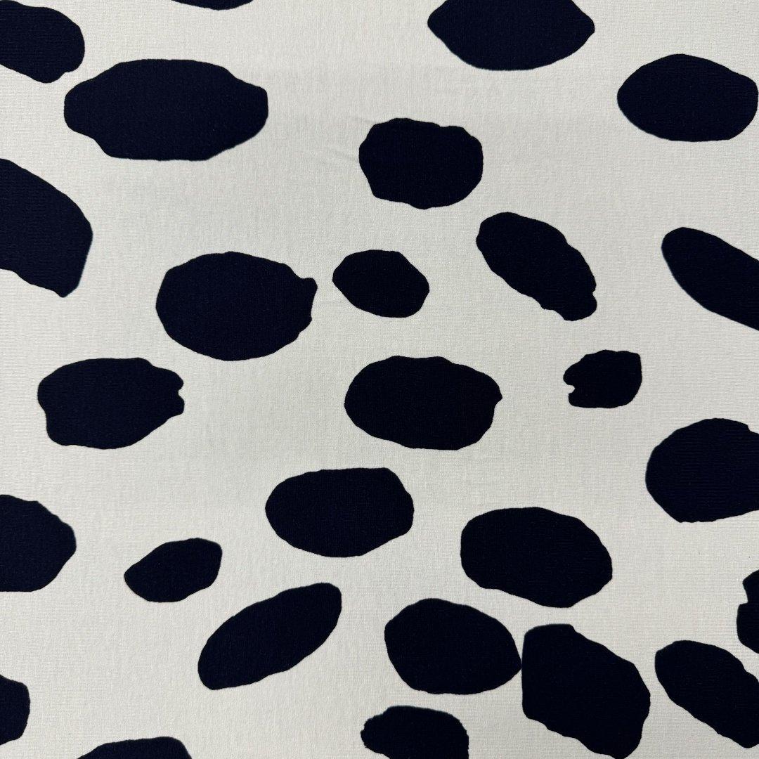 White with Navy Splat Attack is 150cm wide. This is a quality jersey fabric with a fun, classic print that is complimented by the attractive combination of white and navy. This viscose elastane is soft with a heavy drape and perfect for maxi dresses, tight skirts, drape tops, wide leg trousers, leggings, jumpsuits, playsuits, lounge wear and so much more.